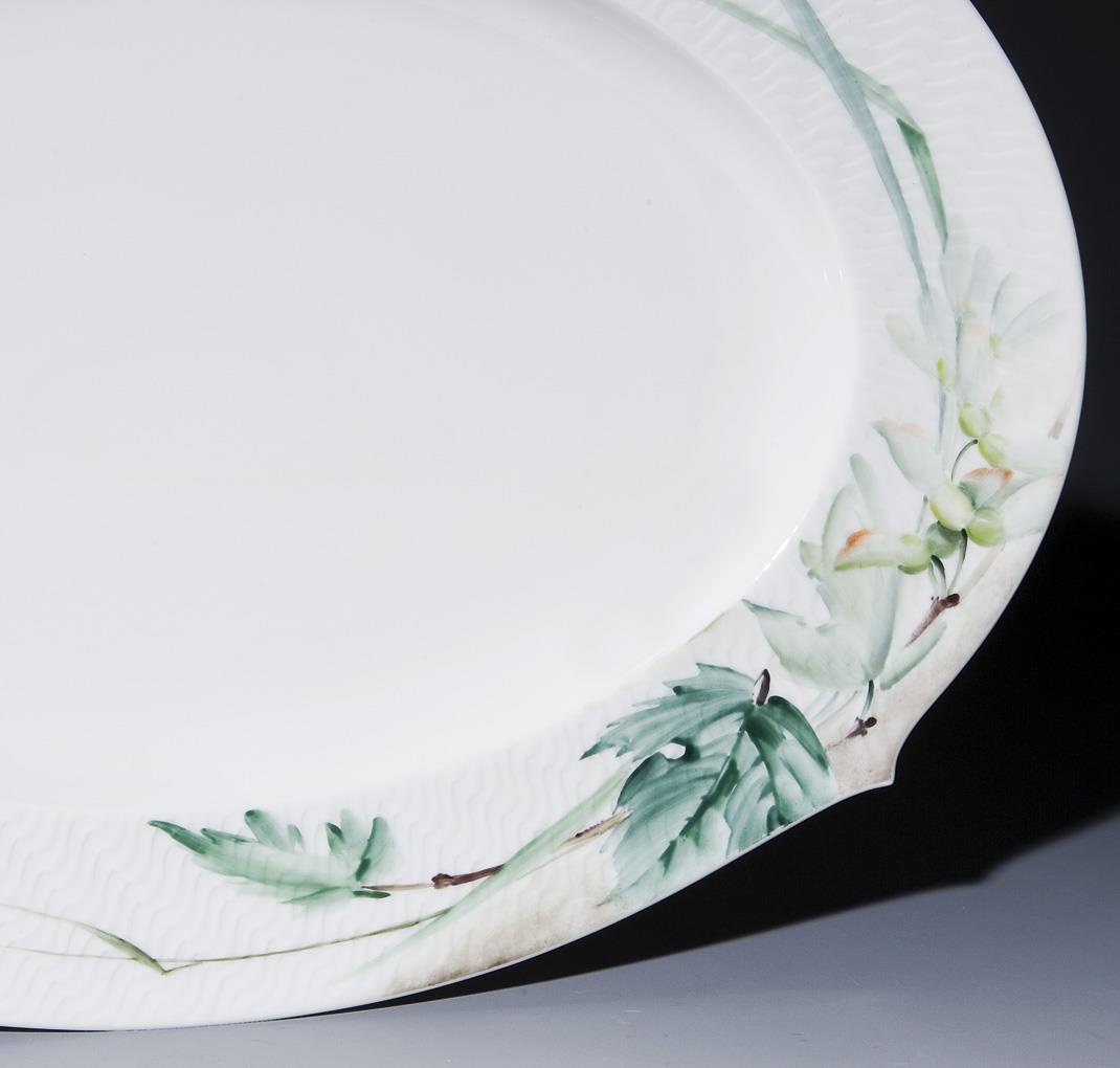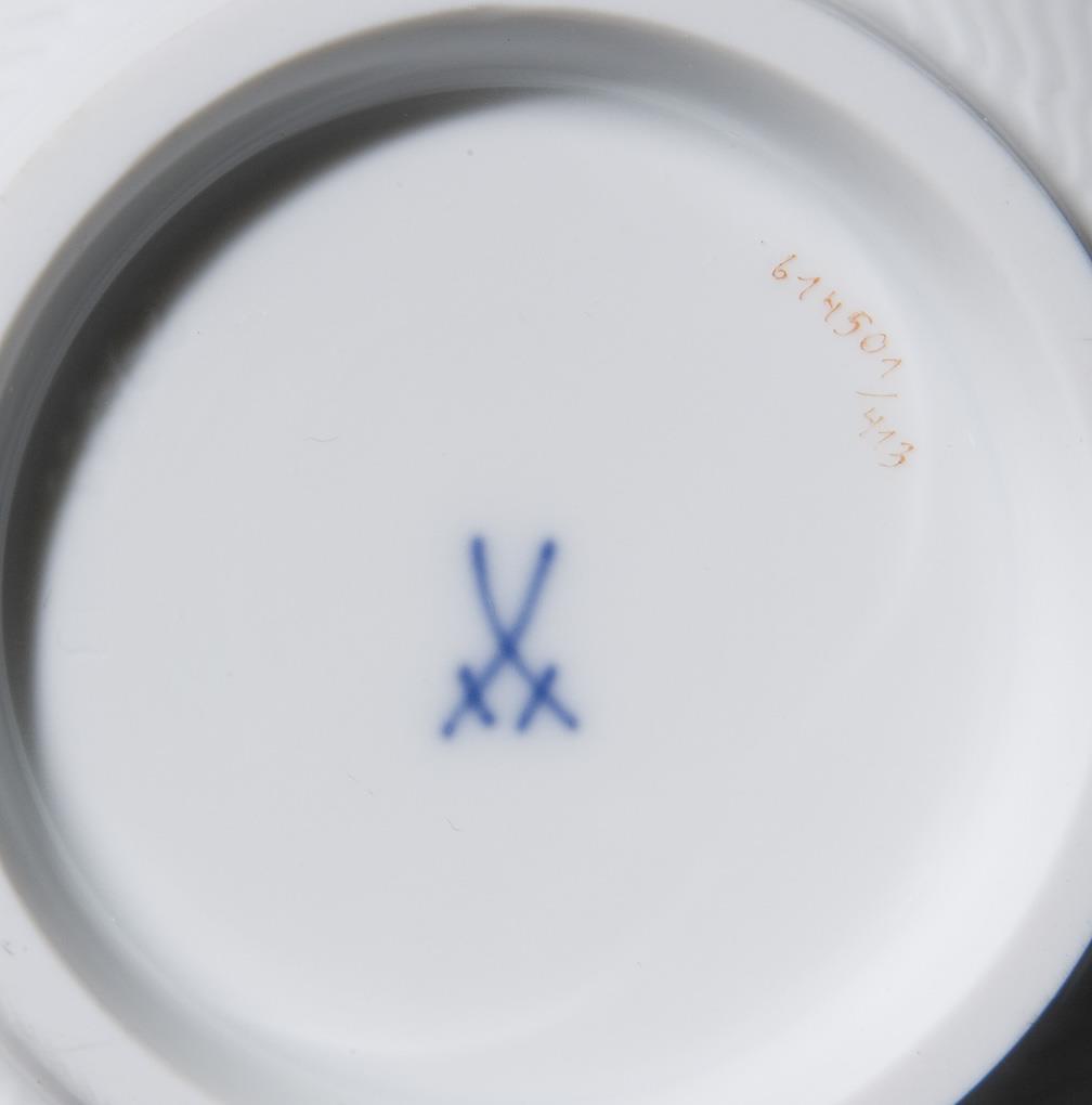 Form-Modell von Sabine Wachs und Jörg Danielczyk 1996. Form "Wellenspiel-Relief". 4 Essteller, 4 Suppenteller, 4 Dessertschalen, 2 Schalen, 2 Platten. Dekor-Nr. 614501. Farbig bemalt, Dekor "Waldflora und Insekten". Pressmarken, Malermarken, Schwertermarken.