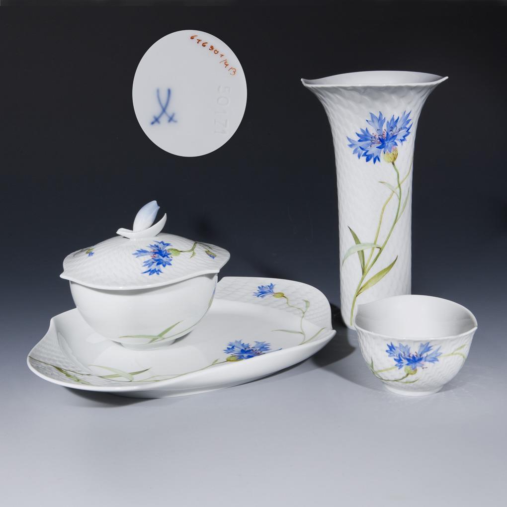 Form-Modell von Sabine Wachs und Jörg Danielszyk 1996. Form "Wellenspiel-Relief". Dekor-Nr. 616901. Farbig bemalt, gold staffiert, Dekor "Kornblume". 1 Vase, 1 Bonbonniére, 1 Konfektschale, 1 Platte. Pressmarken, Malermarken, Schwertermarken.