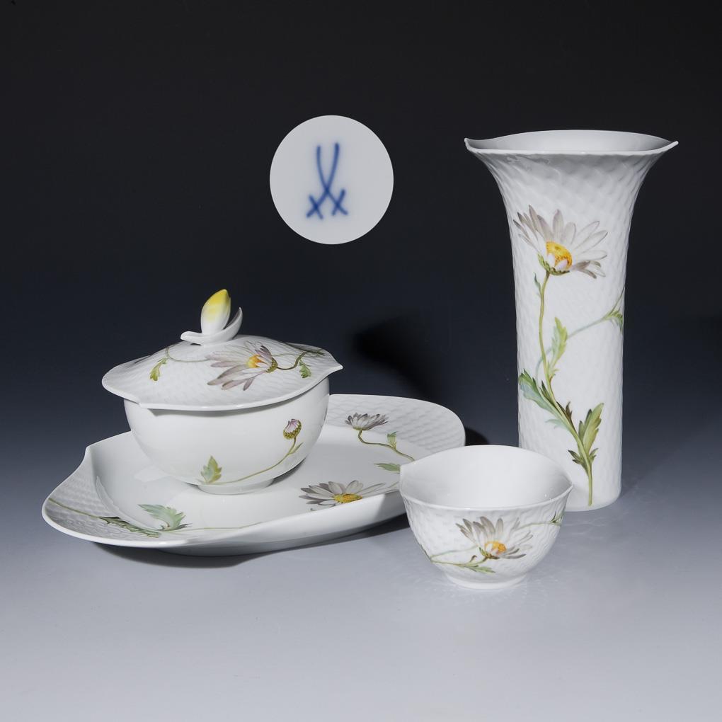 Form-Modell von Sabine Wachs und Jörg Danielczyk 1996. Form "Wellenspiel-Relief". Dekor-Nr. 617601. Farbig bemalt, Dekor "Margerite". 1 Vase, 1 Bonbonniére, 1 Konfektschale, 1 Platte. Pressmarken, Malermarken, Schwertermarken.