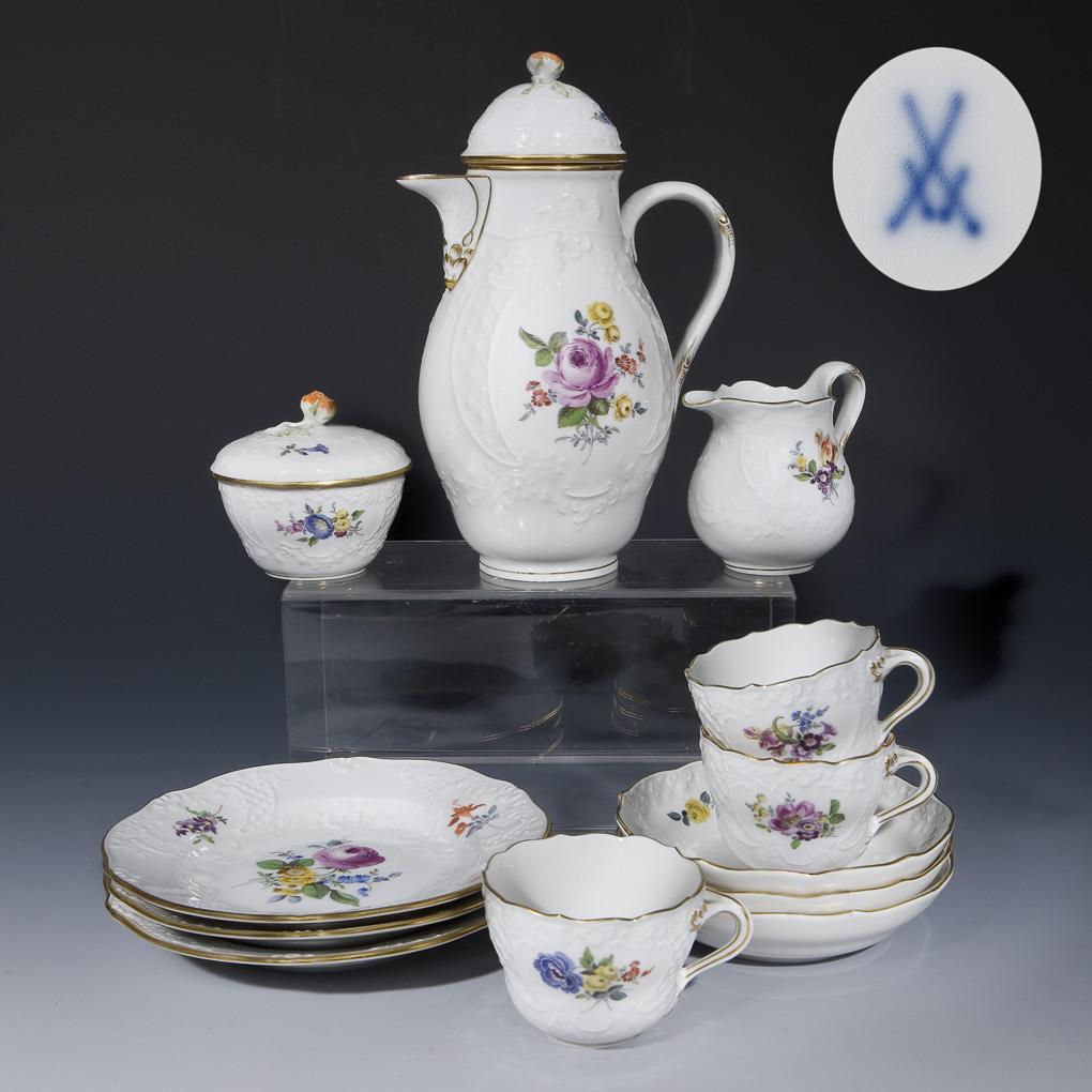 Form "Neuer Ausschnitt". Relief-Modell von Johann Joachim Kaendler 1739. Reliefdekor "Marseille". Dekor-Nr. 160110. Farbige Blumenmalerei, gold staffiert. Kaffeekanne, Zuckerdose, Milchkännchen, 3 Tassen, 3 Untertassen, 3 Dessertteller. Pressmarken, Malermarken, Schwertermarken.