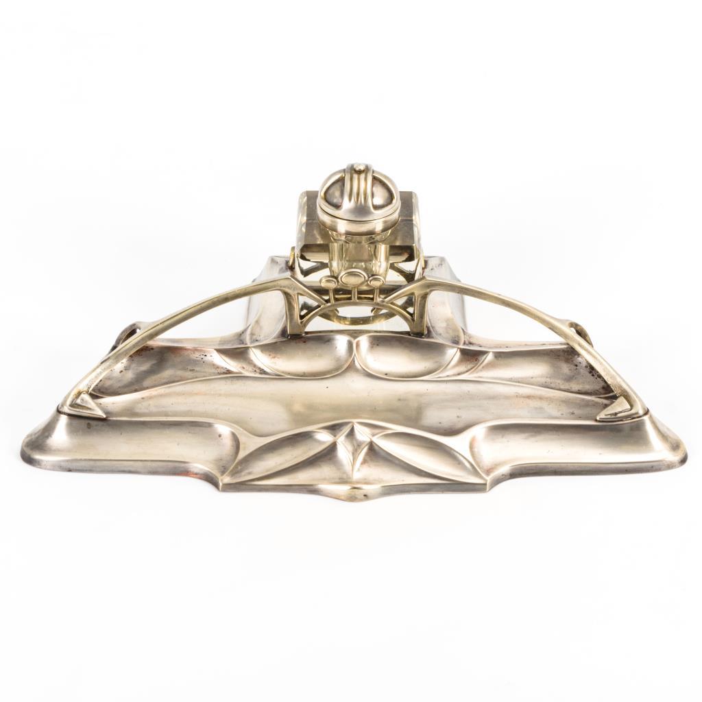 Geschweifte Stiftablage mit Reling sowie gläsernes Tintenfass. Etwas berieben.