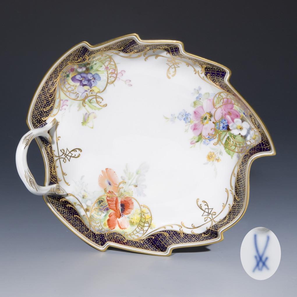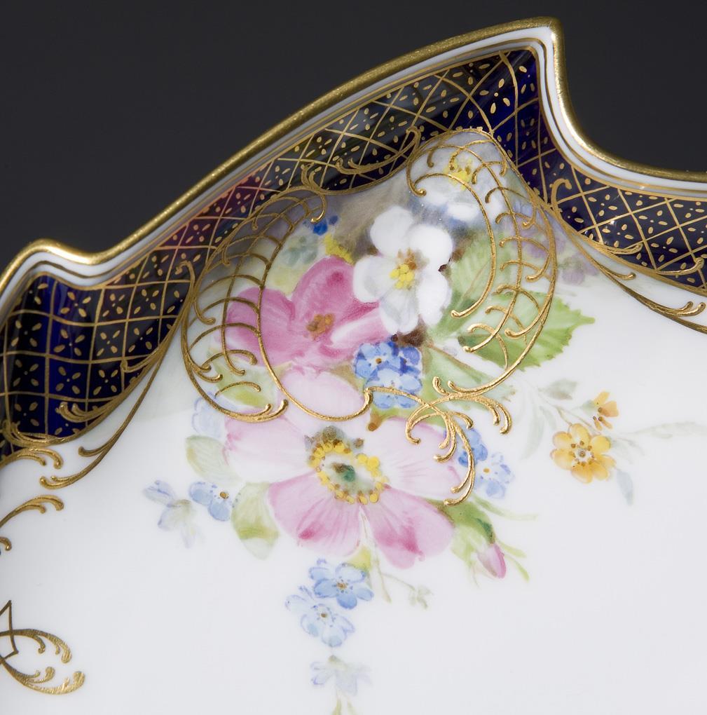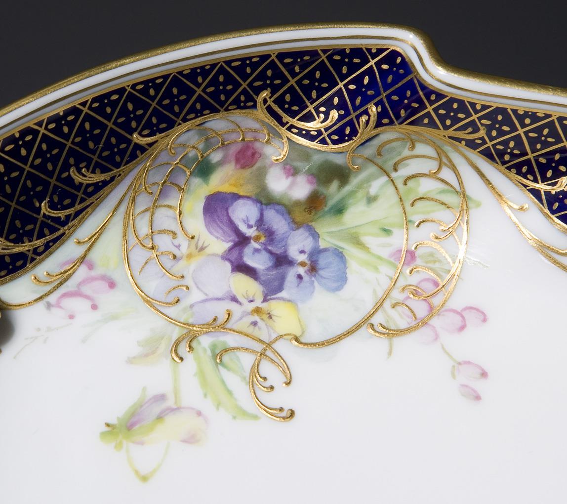 Dekor-Nr. 959190. Kobaltblauer Rand mit goldenem Mosaikdekor. Impressionistisch angelegte farbige Blumenmalerei, Reliefgold, Goldstaffage. Pressmarken, Malermarke, Schwertermarke.
