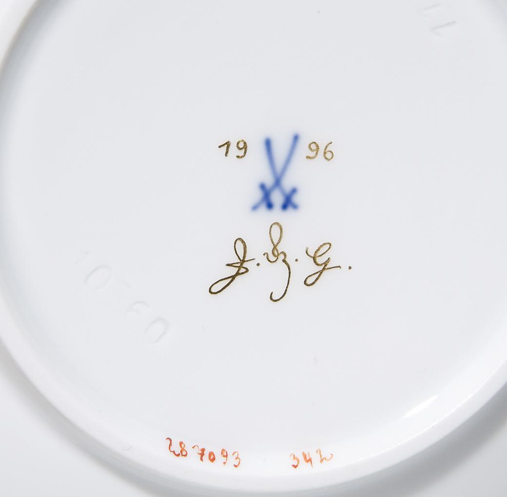 Frontal Goldreserven mit Lüsterfond und feiner farbiger Bemalung nach Vorlagen von Johann Gregorius Höroldt. Umlaufend indische Blumen und Insekten, Goldstaffage. Dekor-Nr. 287093. Pressmarken, Malermarken, Schwertermarken, goldenes Sonder-Signet.