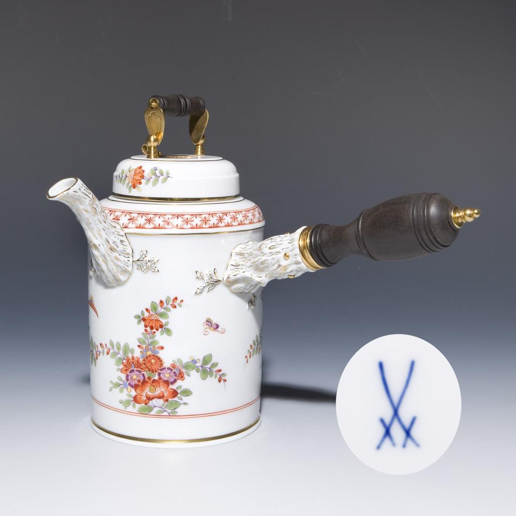 Dekor-Nr. 588690. Umlaufend farbige Bemalung, Dekor "Indische Blumen" mit Goldpunkten und Ornamentkante. Goldstaffage. Zylinderkorpus. Griff und Röhrenausguss reliefiert. Haubendeckel mit Messing-Montierung und Quirl-Öffnung mit Schieber. Gedrehte Holz-Handhabe. Pressmarken, Malermarke, Schwertermarke.