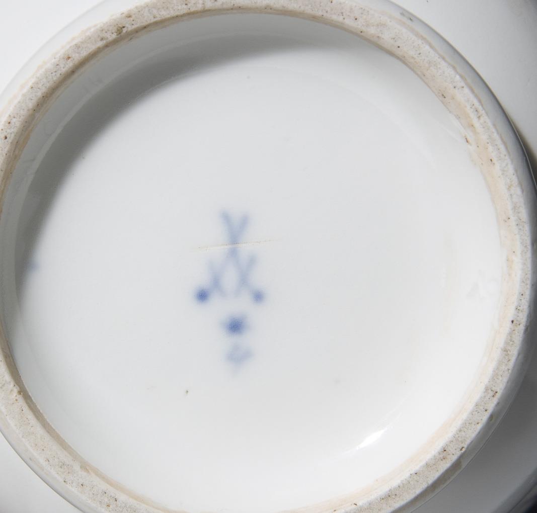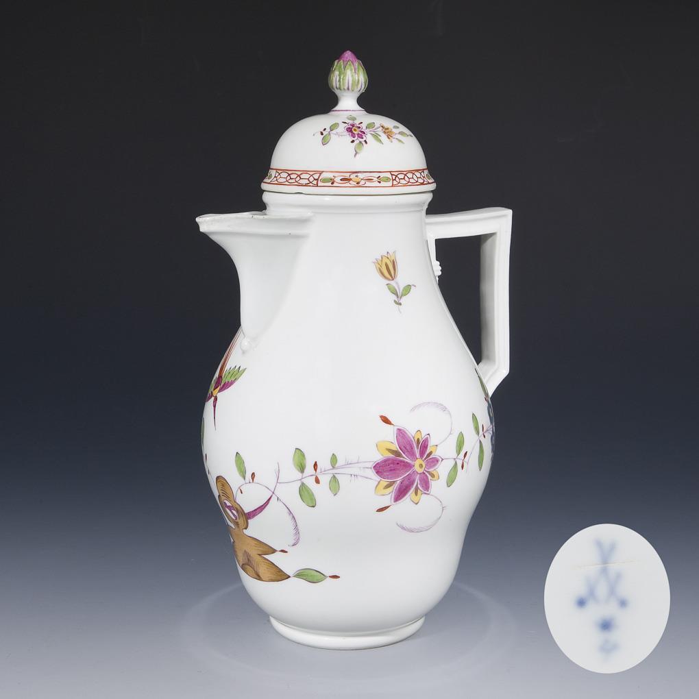 Umlaufend farbige Bemalung. "Fels- und Vogeldekor". Schwertermarke mit Stern einmal gestrichen. Ausguss und Mündung mit kleinem Glasurdefekt, Deckel restauriert.