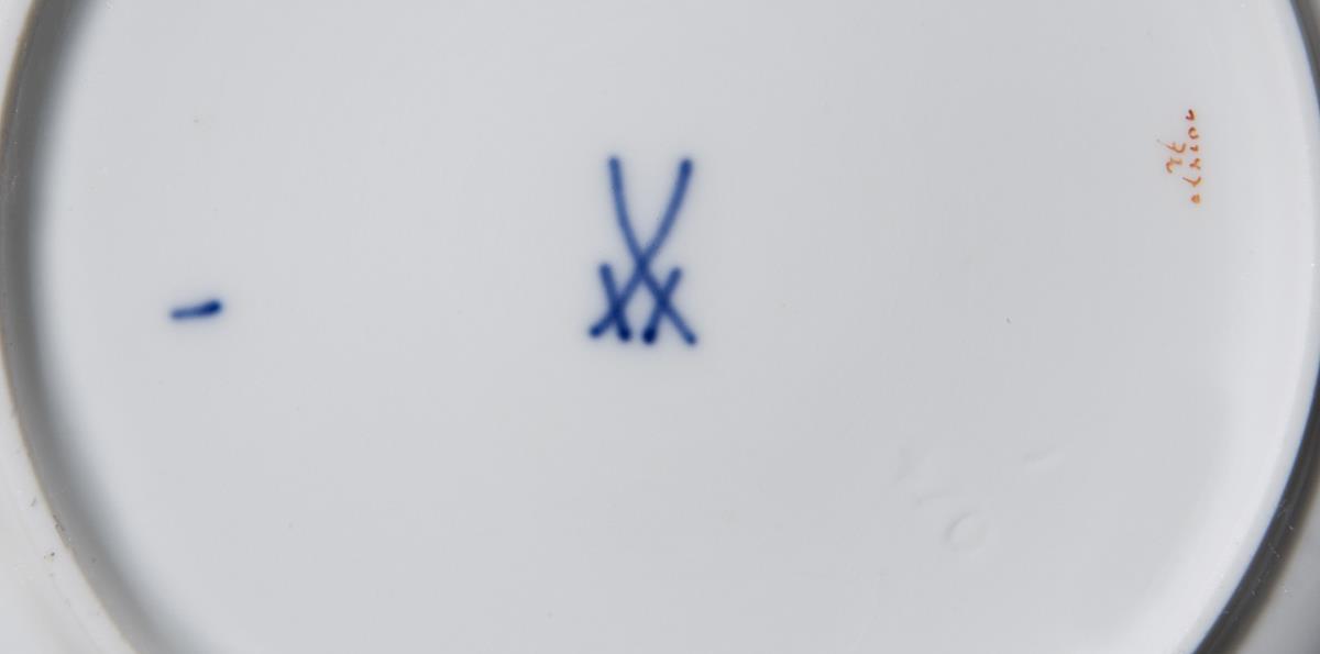 Form "Neuer Ausschnitt". Dekor-Nr. 101470. Kobaltblauer Fond, 4-passig geschweifte Goldreserven mit farbig gemalten Blumenbuketts, Goldstaffage. Pressmarken, Malermarken, Schwertermarken.