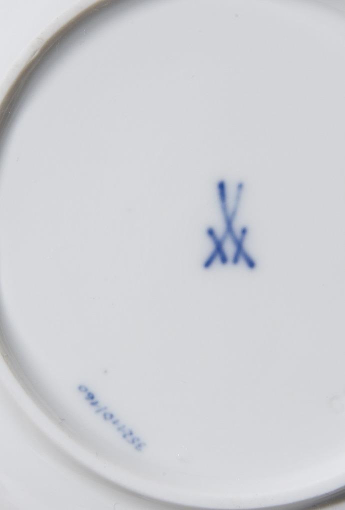 Form "Neuer Ausschnitt". Dekor-Nr. 352110. Kobaltblaue Unterglasurmalerei, farbig bemalt, gold schattiert, gold staffiert, "Tischchendekor". Pressmarken, Malermarken, Schwertermarken.
