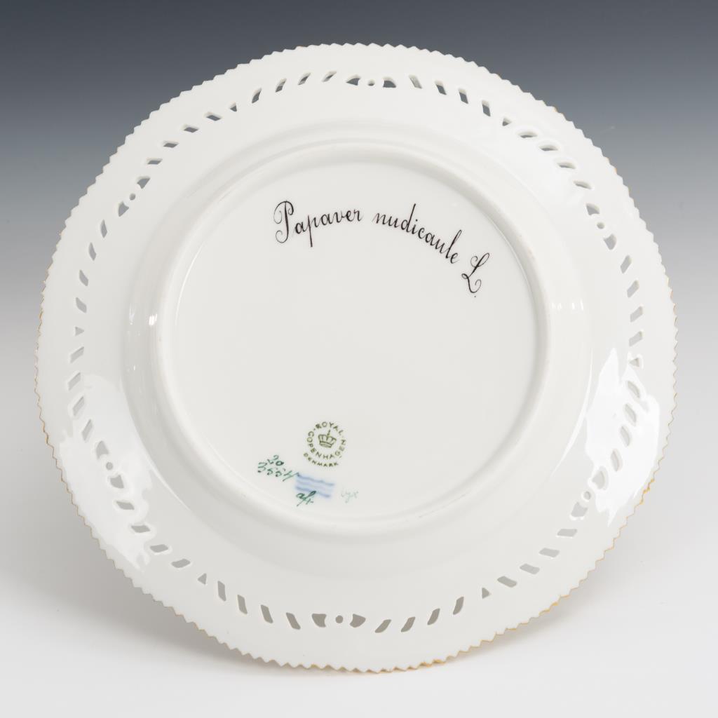 Teller mit stabdurchbrochener Fahne und gezacktem Rand. Im Spiegel eine fein gemalte Pflanze des Islandmohns, unterseitig lateinisch bezeichnet.