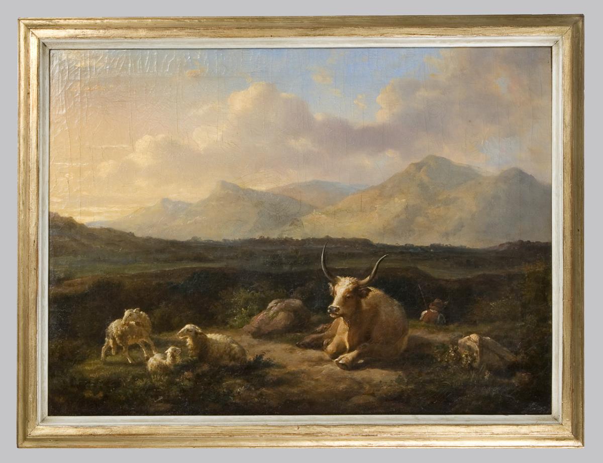 Im Vordergrund der weiten romantischen Landschaft ist ein liegendes Chianina-Rind plaziert (Chianina-Rinder sind die älteste und die größte Rinderrasse der Welt, sie stammen ursprünglich aus der Toskana und Umbrien). Originaler Keilrahmen, profilierter Goldrahmen. Craquelé.