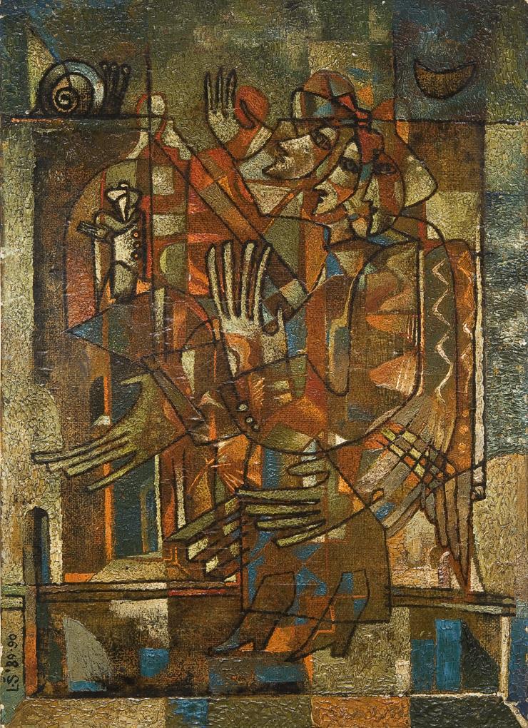 Kubistische Komposition. Die Darstellung wird aus verschiedenen Blickwinkeln betrachtet, die Form zum Inhalt. Rückseitig mit kyrillischem Titel bezeichnet.