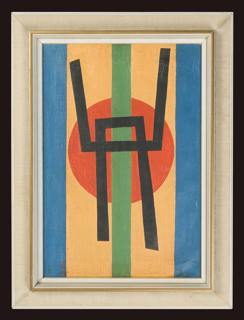 Konstruktivistische Malerei mit kräftigen bunten Farbflächen, runden und eckigen Formen. Weiß gefasster Rahmen mit Leinenbezug. Partiell Craquelé.