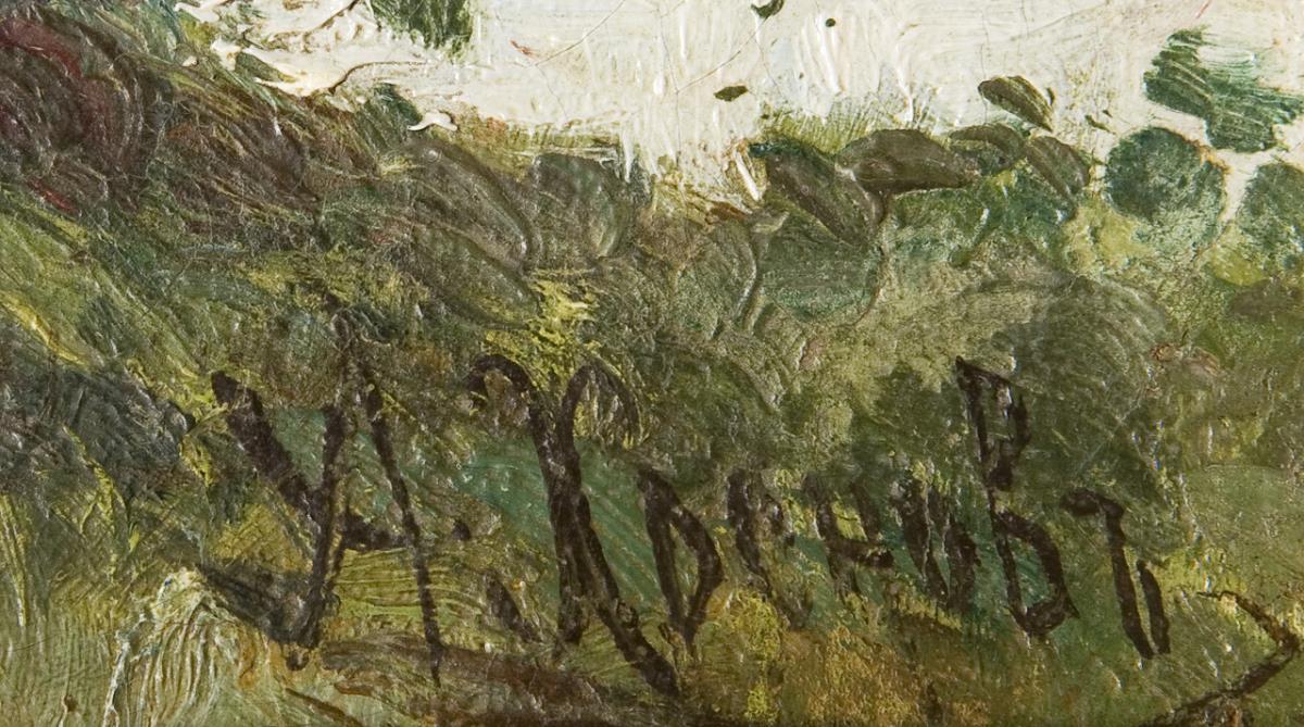 Romantischer, überlegt komponierter Landschaftsausschnitt. Rückseitig auf dem Keilrahmen alt kyrillisch bezeichnet. Vergoldeter Stuckrahmen. Rückseitig ein kleiner Flicken, Rahmen partiell defekt.
