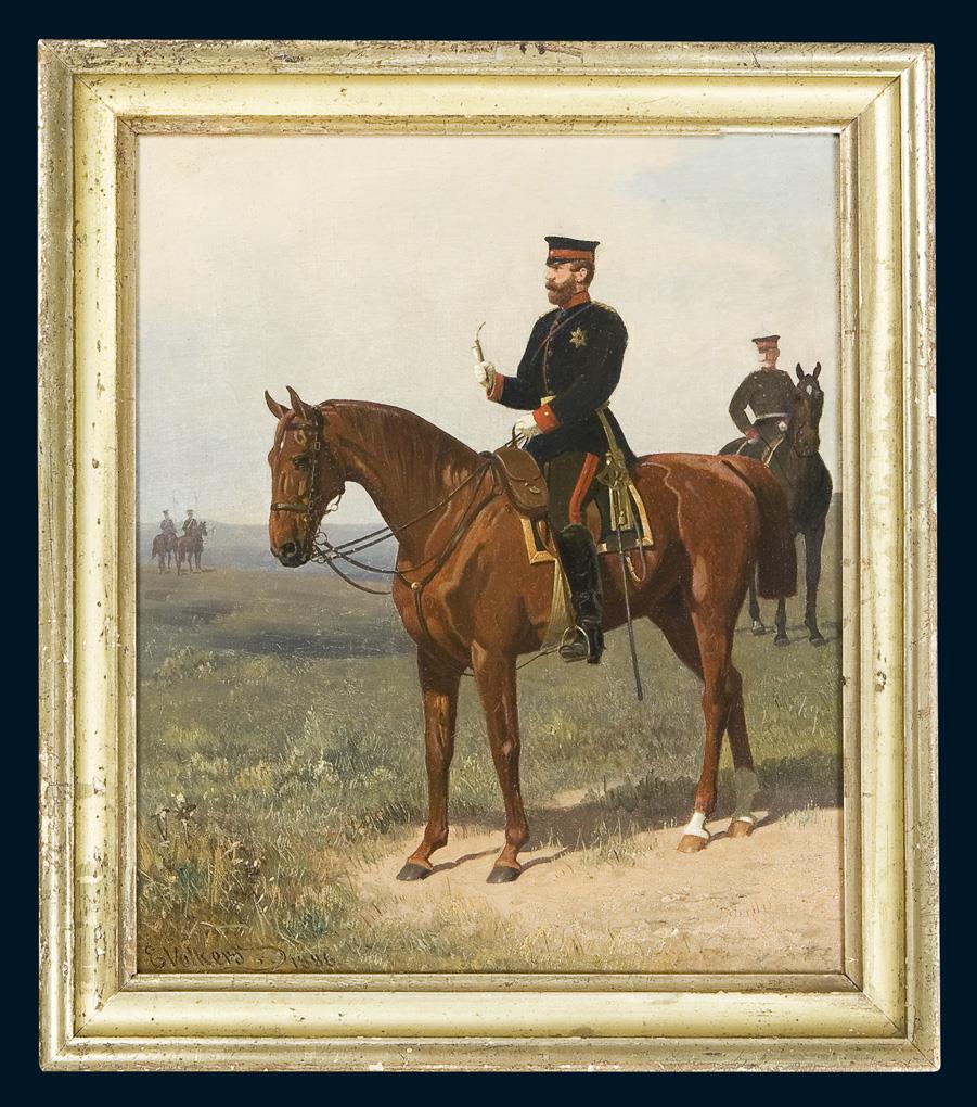 Die Darstellung ist eine Kombination von Pferde- und Porträtmalerei. Friedrich von Preußen, 1831 Potsdam - 1888 Potsdam, 1888 als Friedrich III. deutscher Kaiser und König von Preußen (der "99-Tage-Kaiser"). Waschgoldrahmen.