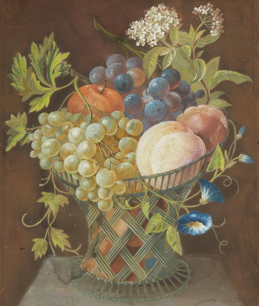 Dekorativ ist ein prall gefüllter Obstkorb als eine in die Fläche ausgebreitete Einheit konzipiert. Die Feinheit der Farben eignet sich hervorragend, den angestrebten Detailreichtum zu verwirklichen. Breiter verglaster, vergoldeter Stuckrahmen. Am oberen Rand ein Riss, im unteren Bereich zwei Flecken.