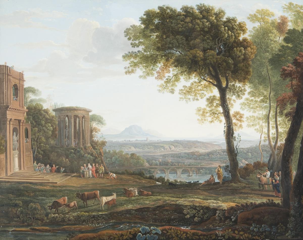 Arkadien, eine Landschaft, verklärt zum Ort des Goldenen Zeitalters, wo Menschen unbelastet in einer idyllischen Natur als glückliche Hirten lebten. Das Thema zahlloser Gemälde des 16. bis 18. Jahrhunderts. Die sichtbar gewordene Harmonie zwischen Mensch, Natur und Geschichte wurde zum Vorbild für viele Maler der kommenden Generationen * Partnerauktion Bergmann.