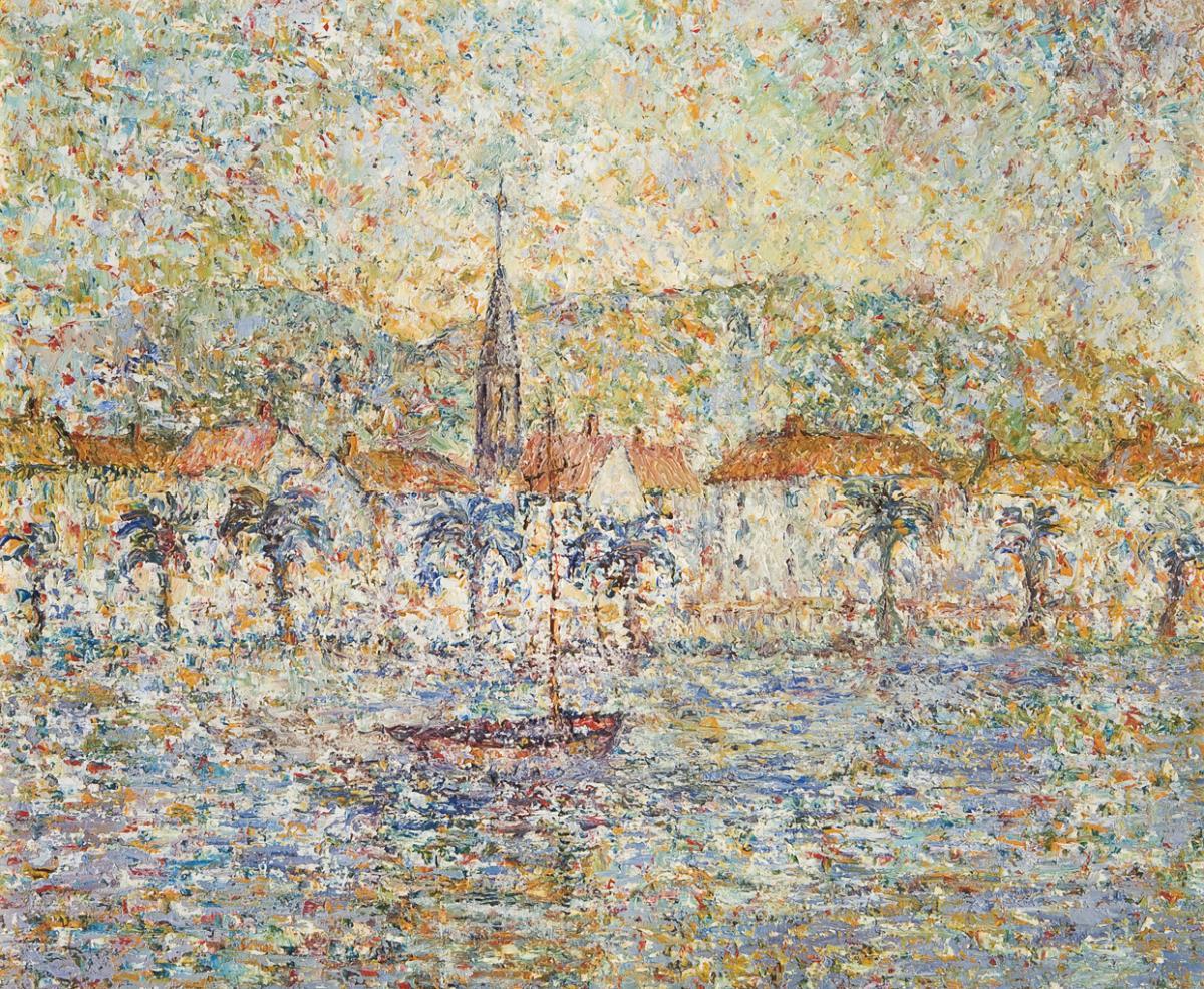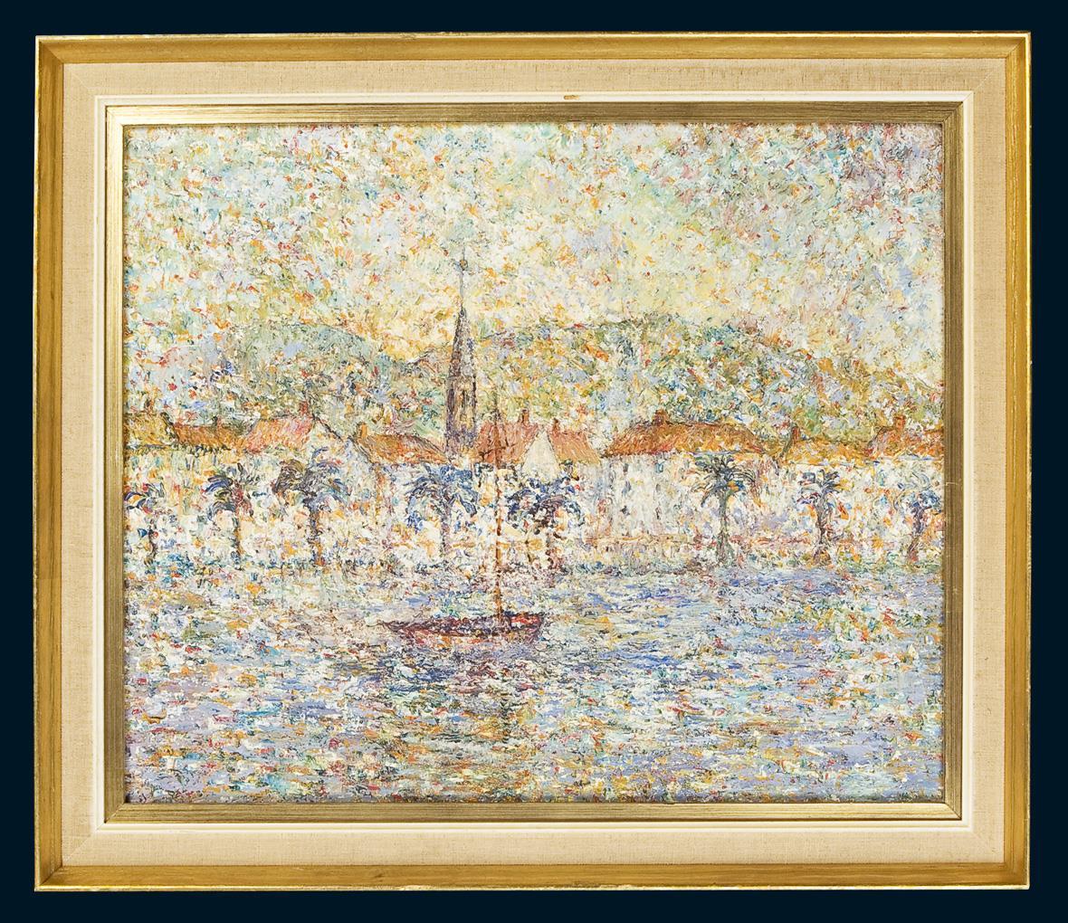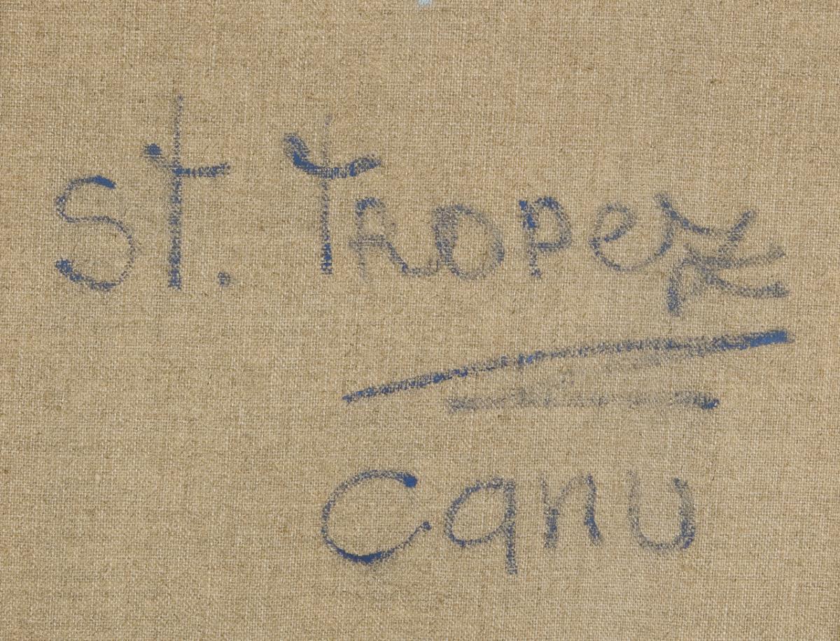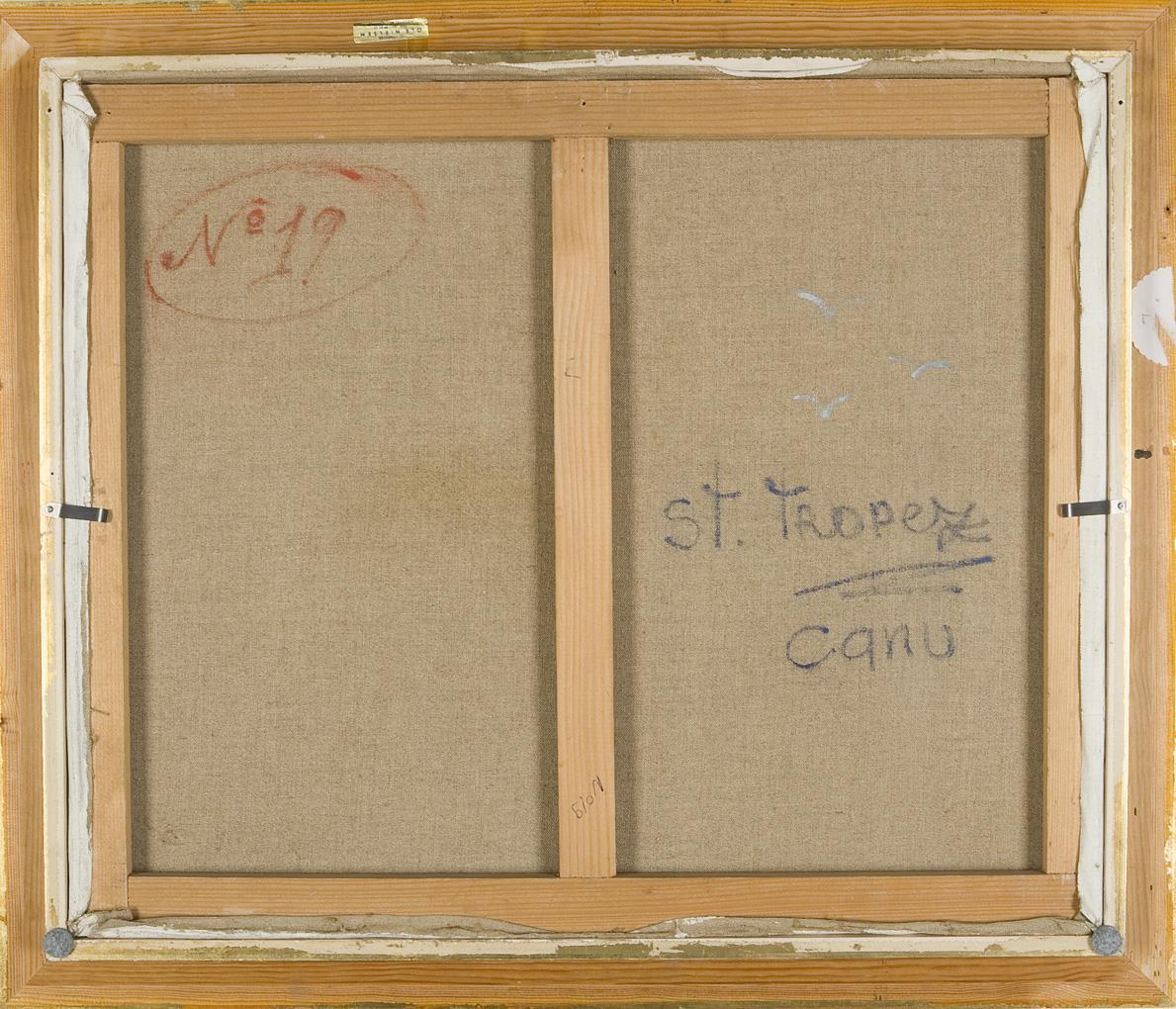 Ansicht in pointillistischer Technik. Das gesamte Bild besteht aus kleinen Farbtupfen. Der Gesamteindruck ergibt sich erst im Auge des Betrachters aus einer gewissen Entfernung. Rückseitg auf der Leinwand bezeichnet: St. Tropez, Canu. Goldrahmen mit Leinenbezug.