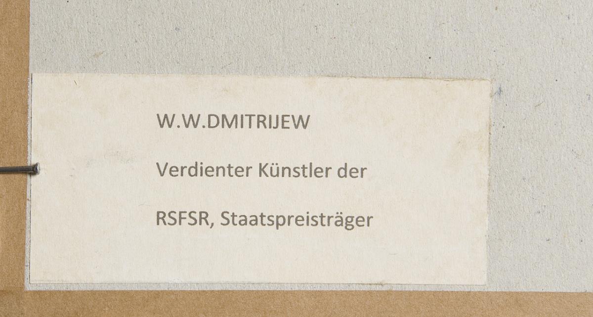 Rückseitig Klebezettel: W. W. Dmitrijew, Verdienter Künstler der RSFSR, Staatspreisträger. Passepartout, verglaster Profilrahmen. Partiell minimal defekt.