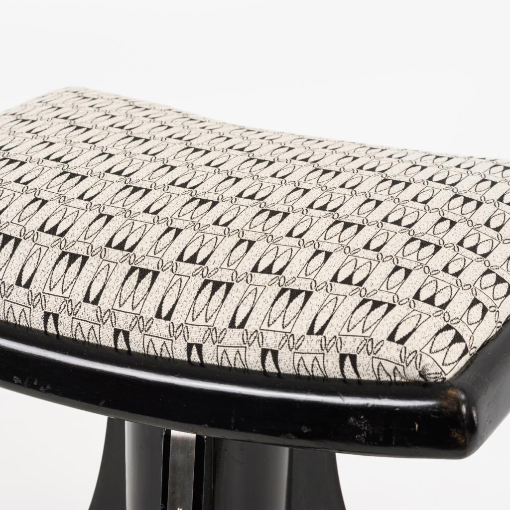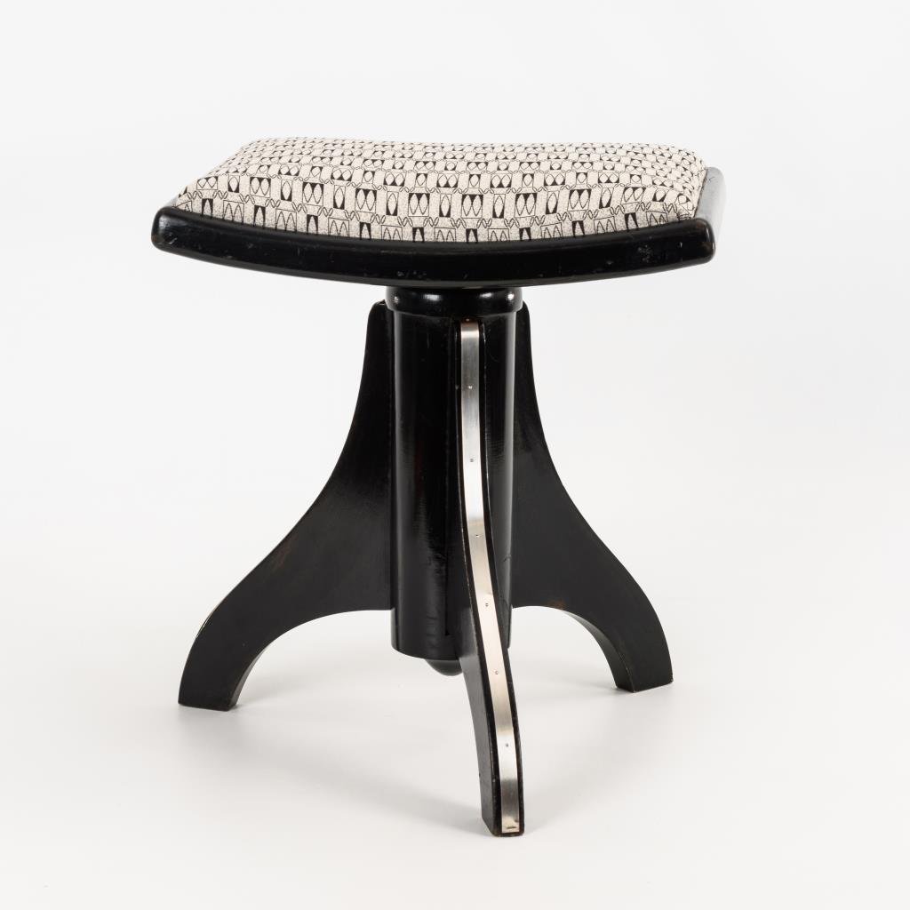 Rechteckiger Hocker im Design-Jugendstil mit Mittelstütze und 3 gebogten Beinen mit Metallapplikationen, Bezug mit stiltypischem Muster. Polster und Bezug ergänzt, Gebrauchsspuren.