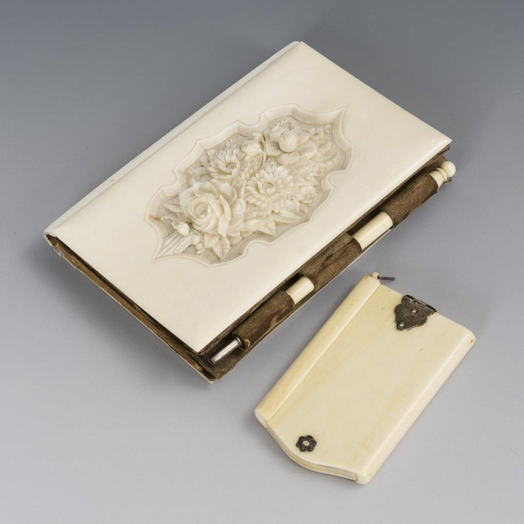 Notizbuch mit Elfenbein-Buchdeckeln; vorn fein geschnitztes Blumenbukett als Deckel für eine verglaste Miniatur (2,5 x 1,5 cm). Verschluss durch Elfenbein-Drehbleistift; innen grüner Samt mit unbeschriebenen Blättern (Widmung von 1934). / Ähnlich einem Ballbüchlein auffächerbares Notizbuch mit Silberschließe (geprüft) und englischer Wochentag-Beschriftung auf den Elfenbein-Blättern. Gerissene Buchgelenke jünger verstärkt, Feuchtigkeitschäden innen. / Ergänzter Bleistift mit Bein.