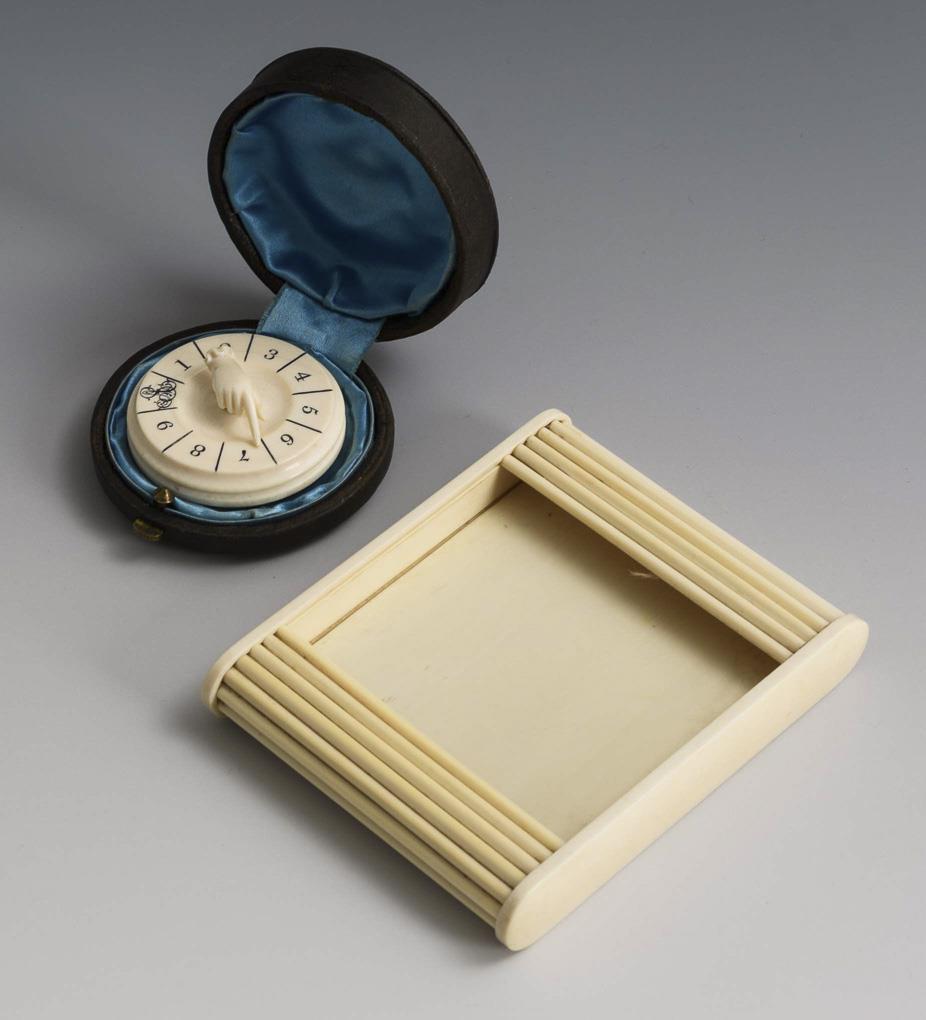 2x Elfenbein: Zeiger-Roulette im Originaletui und Rollbox-Zigarettenetui.