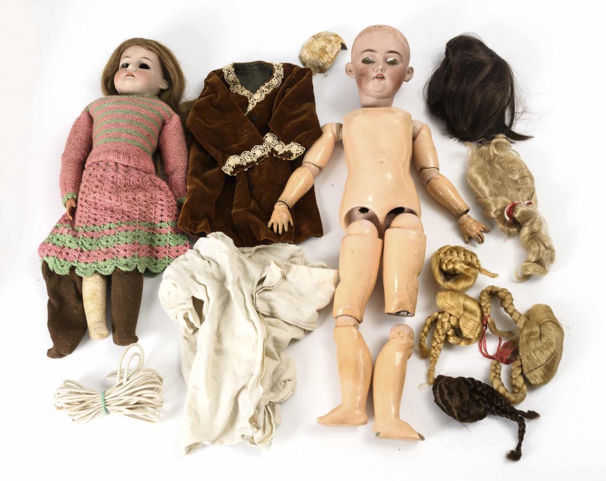 Brustkopfpuppe (Armand Marseille 370) mit Lederkörper. Zerlegter, 13-teiliger Gliederkörper mit defektem Biskuit-Kurbelkopf "S & C". Dazu: 6 Kunsthaarperücken, 1 schöner alter Samtkittel, 1 Unterhemd, 5 m Spanngummi. Lederkörper an einem Kniezwickel defekt.