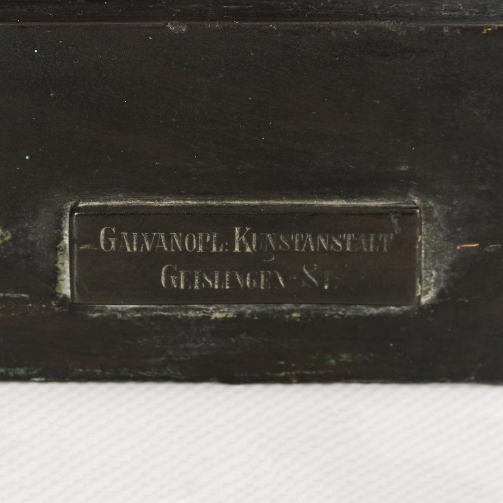 Galvanoplastik bronzefarben patiniert. Firmenplakette "Galvanopl. Kunstanstalt Geislingen-St." (WMF). 95 x 47 x 39 cm.