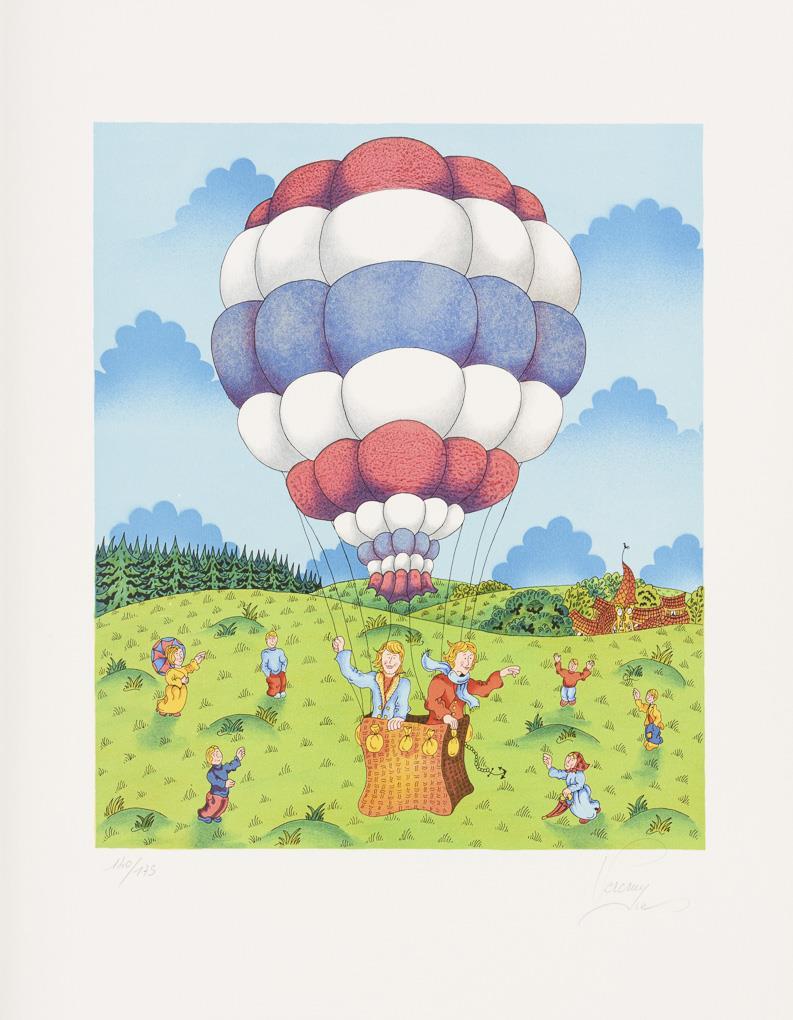 Street Musician, color silkscreen on laid paper, sheet: 49 x 42 cm | Balloon Ride, color silkscreen on laid paper, sheet: 54.3 x 42 cm, copy: 140/175 | Street Festival, color etching on Arches laid paper, sheet: 66.5 x 50.5 cm, copy: 28/150 | Street Scene, color etching in blue on Arches laid paper, sheet: 65.7 x 50 cm, copy: 27/150, top left corner with crease | Street Scene, color silkscreen on BFK Rives laid paper, sheet: 75.7 x 56 cm.