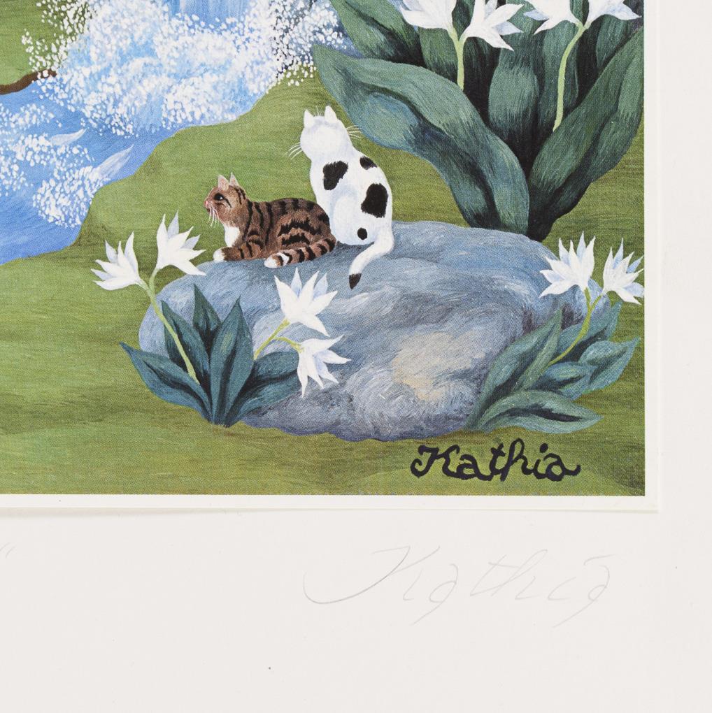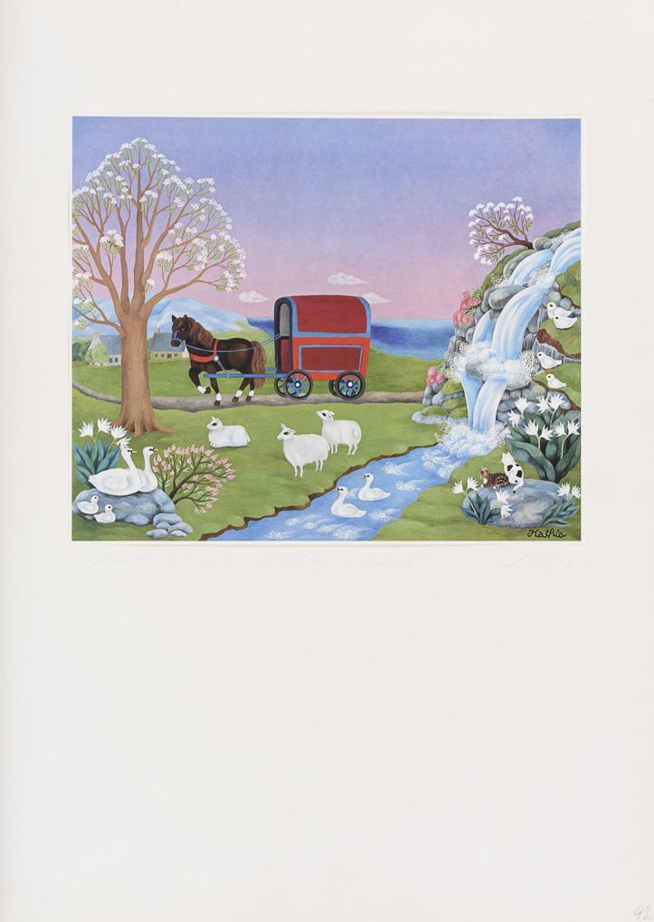 "Spring in Ireland", plate: 32,5 x 39 cm, mounted on cardboard: 70 x 50 cm, artist's copy | Still Life with Flower Bouquet and Cat, plate: 45,7 x 38 cm, sheet: 60 x 49,8 cm, copy: 493/555 | Spitz Dog, plate: 36 x 42 cm, sheet: 45 x 50.2 cm, lower left corner with small stain and crease | Still Life with Flower Bouquet, plate: 36 x 32 cm, sheet: 50 x 43 cm | Owl and Cat on a Tree, plate: 29 x 36 cm, sheet: 44 x 50 cm | Cat in Doorway, plate: 40 x 52.4 cm, sheet with grey background: 58 x 68.5 cm.