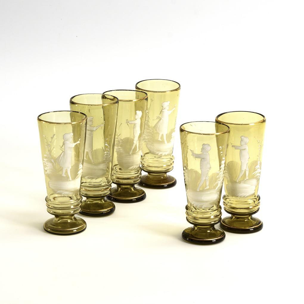 Olive green glass, white enamel painting, gold-staffed. H 17 cm.