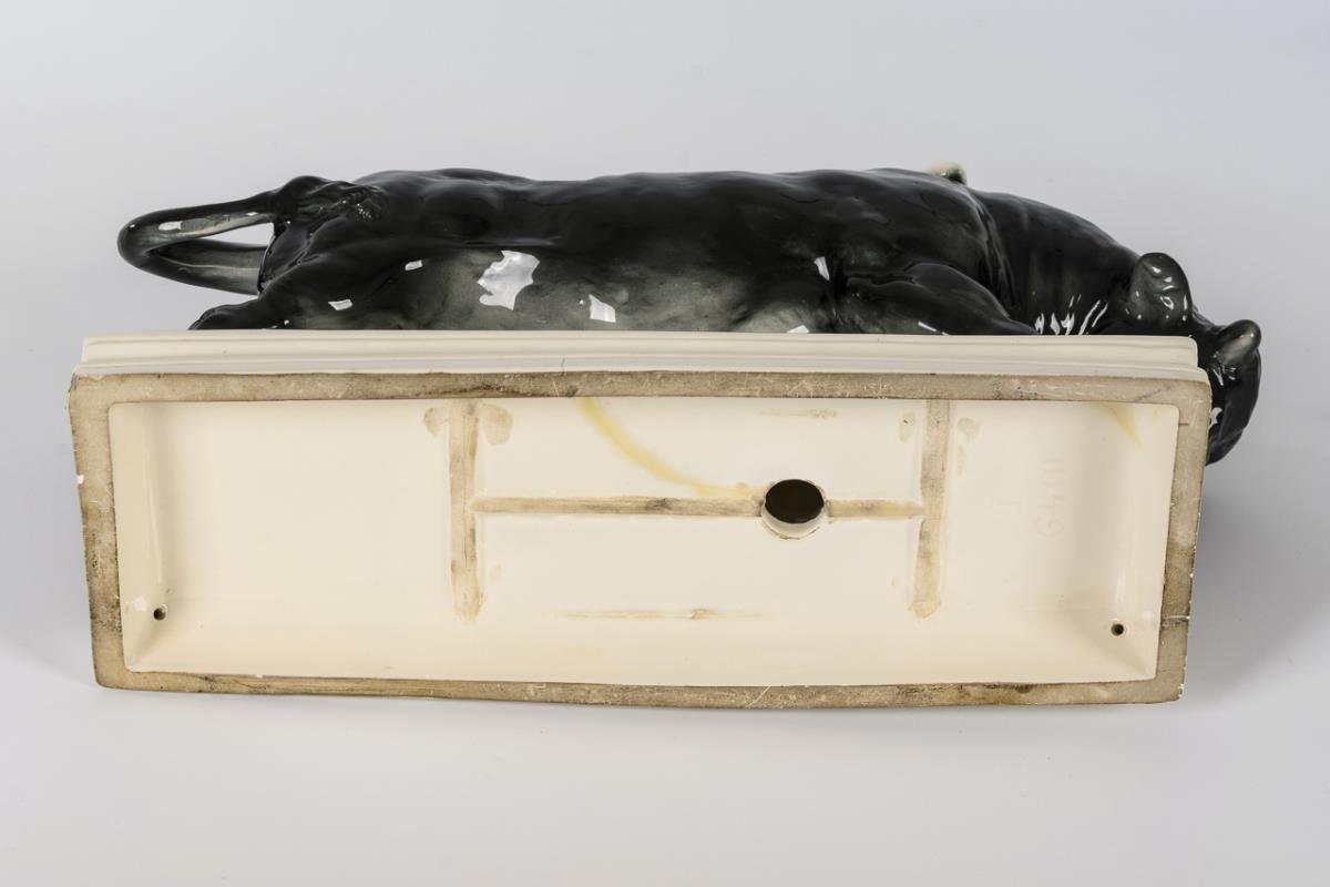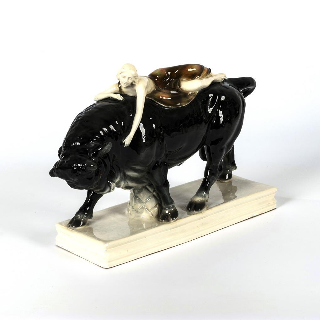 Female semi-nude lying on a bull and caressing it tenderly, on rectangular base. Base cracked on the underside, partially bumped, burnt crack on the right hind hoof.