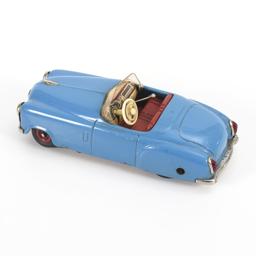 Blue painted tin car with gears, steering and handbrake. Intact factory without key. Little played with.