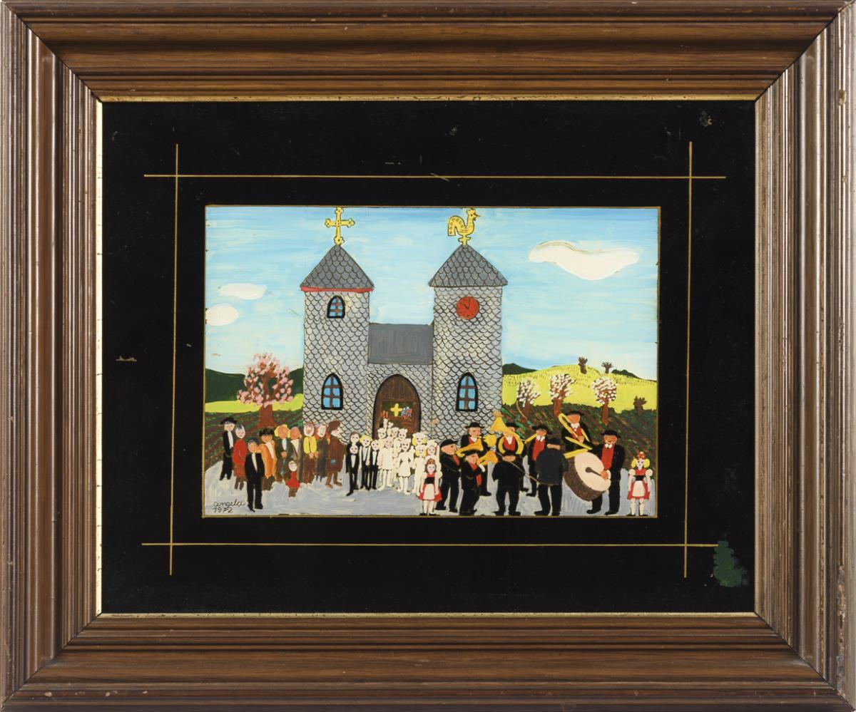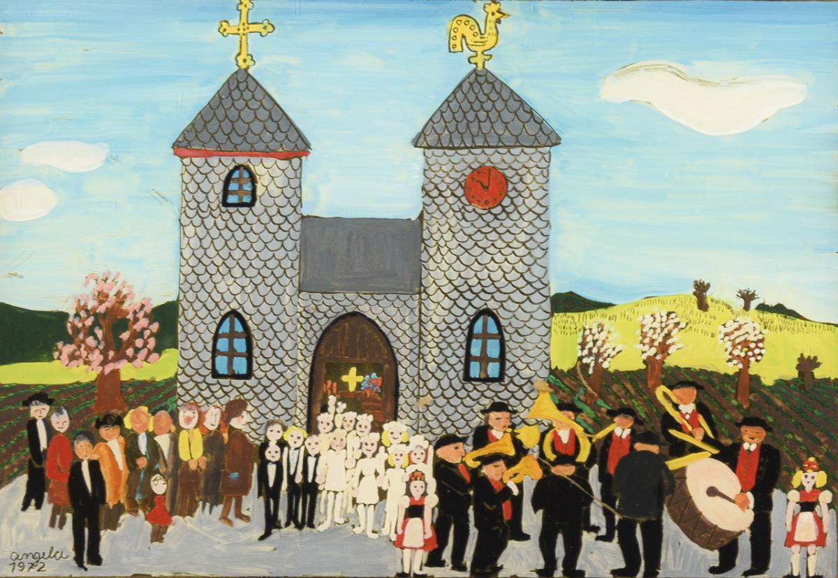 The communicants dressed in white at the church entrance beside the families and the brass band.