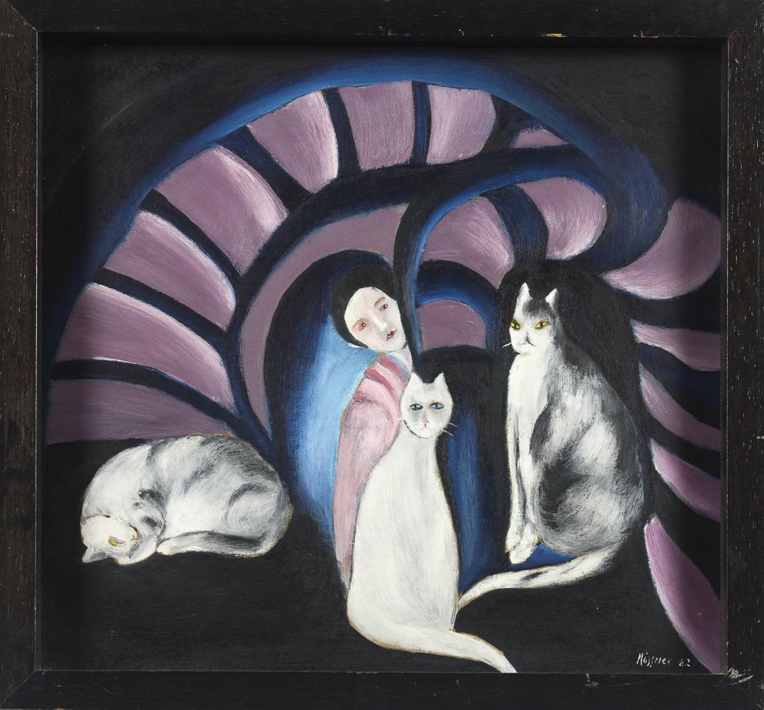 Three cats and a woman in abstract form.