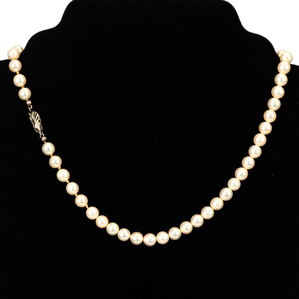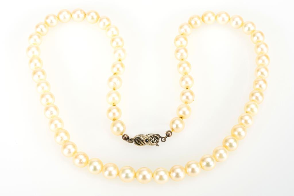 Schnürkette mit cremefarbenen Zuchtperlen (partiell einzelverknotet) an Zierschließe.