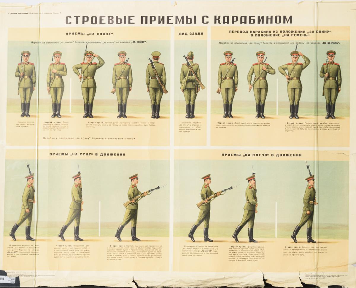 10 posters of Soviet military instruction, including building a Kalashnikov, uniforming, boot care, lining up and military salute, order and cleanliness. Partly with heavy damage.