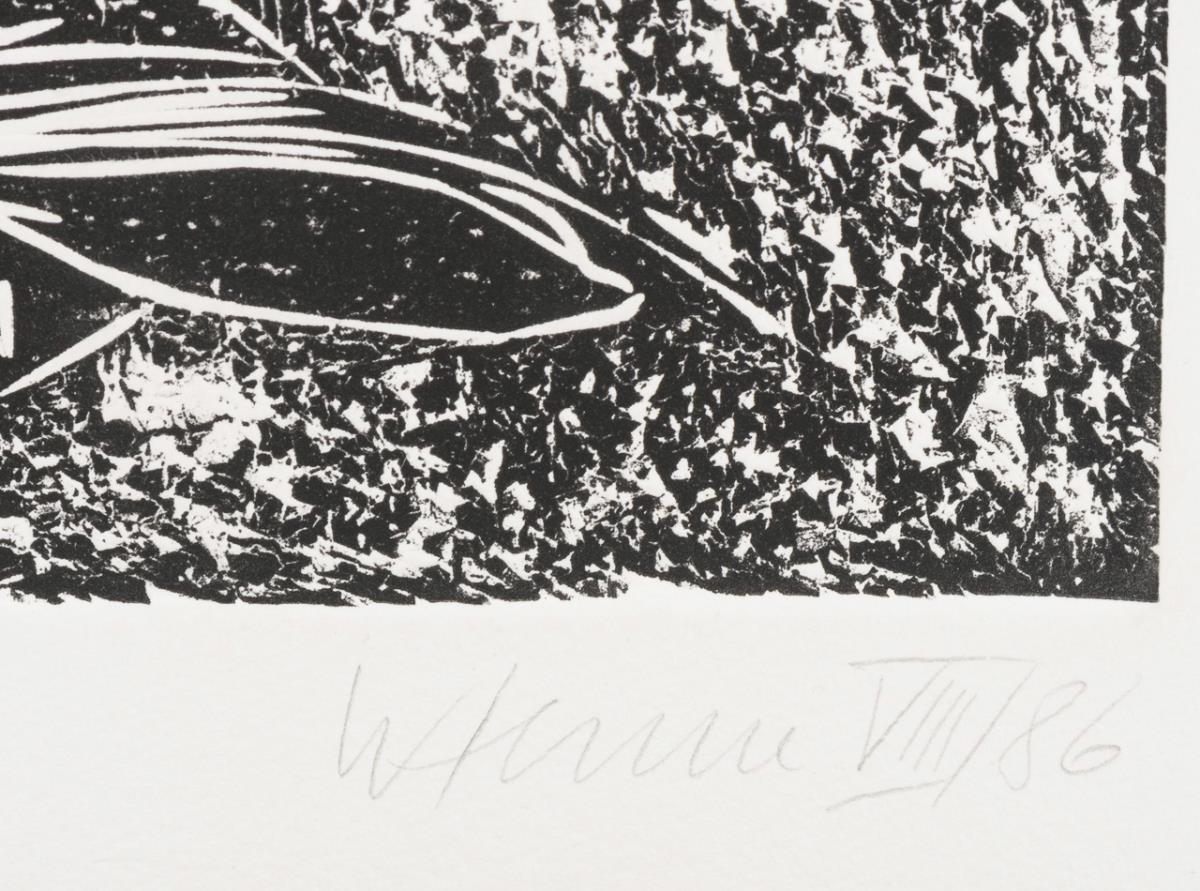 "Shooting Star Time - Make a Wish!", plate: 29.5 x 37.6 cm, sheet: 39.4 x 56.5 cm, copy: 1/10, [19]86 | "geschwollen aufeinander zugehen", etching on Somerset laid paper, embossed stamp "Impressit Rössler Hohenossig", plate: 32.5 x 49.5 cm, sheet: 56.5 x 76 cm, copy: 9/10, 2011, left margin somewhat creased.