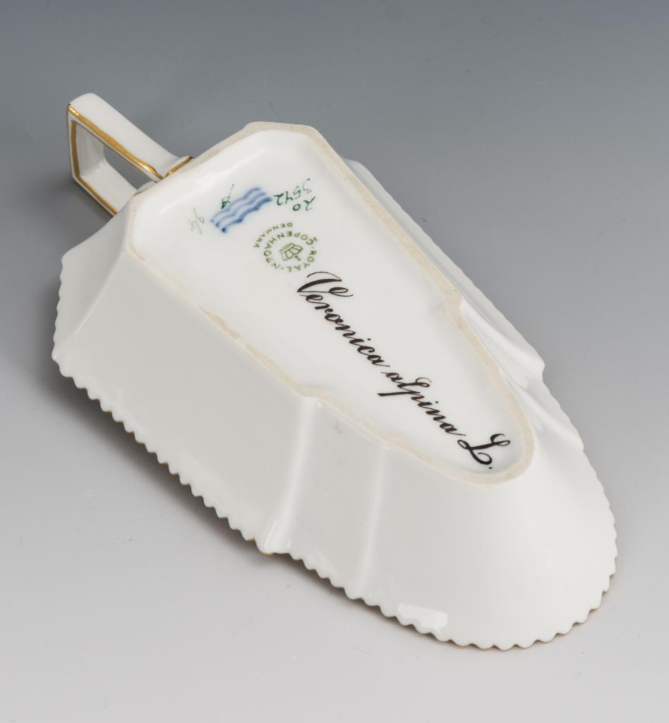 Schälchen mit gezacktem Rand und Henkel. Im Spiegel eine fein gemalte Pflanze des Alpen-Ehrenpreises, unterseitig lateinisch bezeichnet.