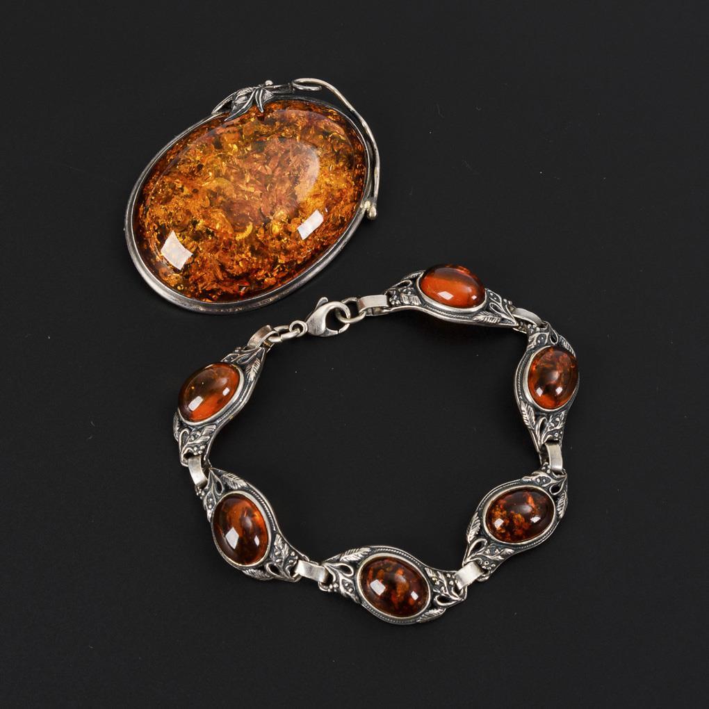 Silver tested. Brooch 5,5 x 4 cm. Bracelet L 20.5 cm. Brooch 25.6 g. Bracelet 20.7 g.