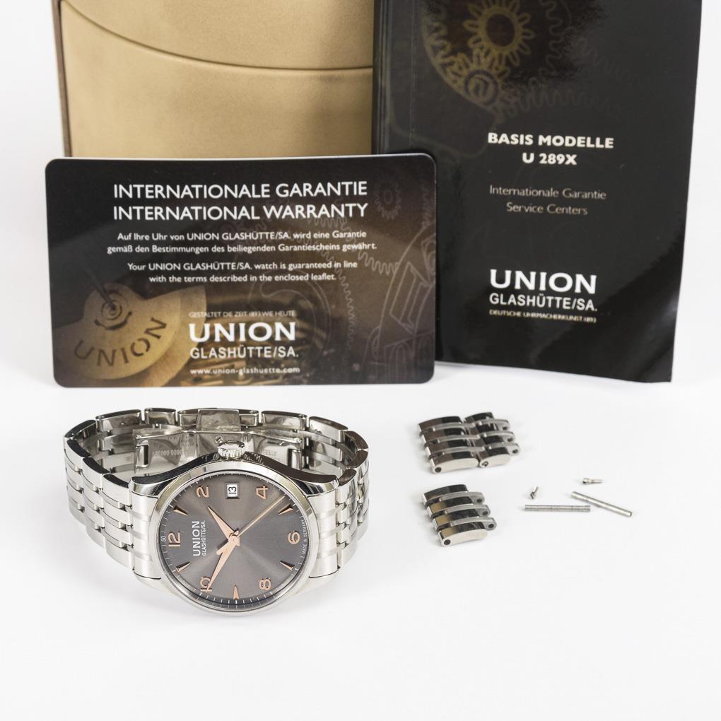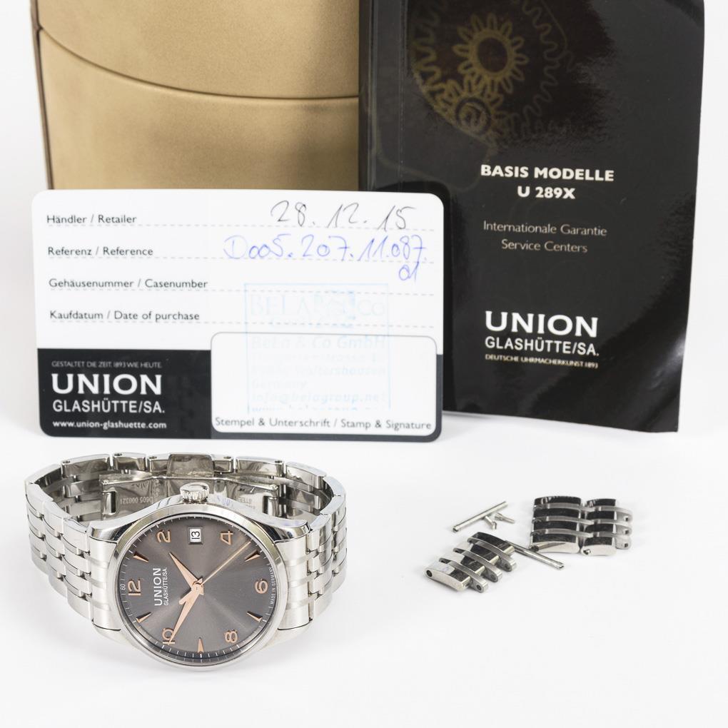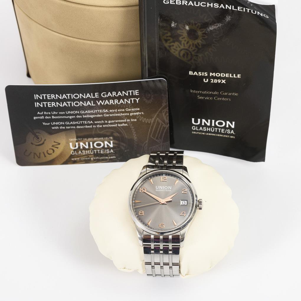 Automatic movement with ball bearing, 21 jewels, marked setting crown, running. Sapphire crystal, anthracite sunburst dial, rose gold Arabic numerals, indices, dauphine hands and central second hand, minute crown and date display. Manufacturer's embossed indication : Union Glashütte/SA.