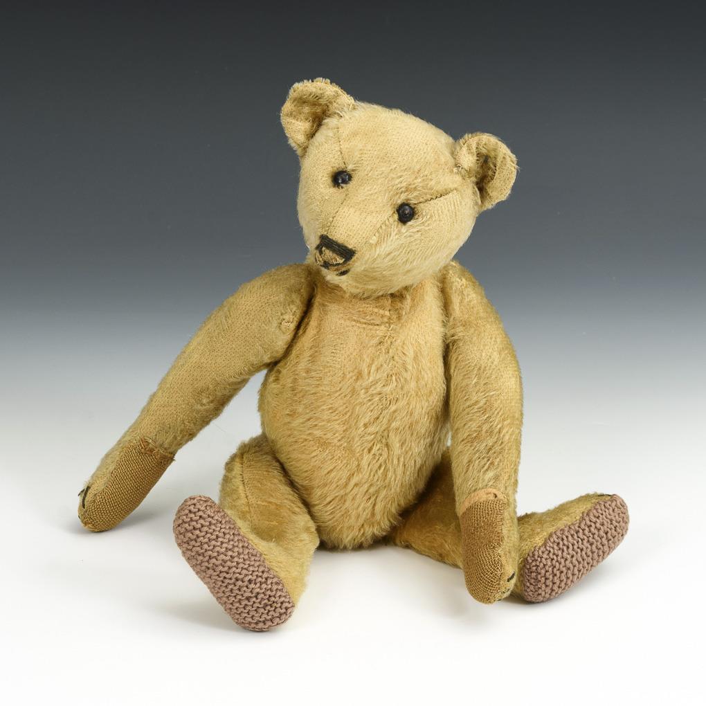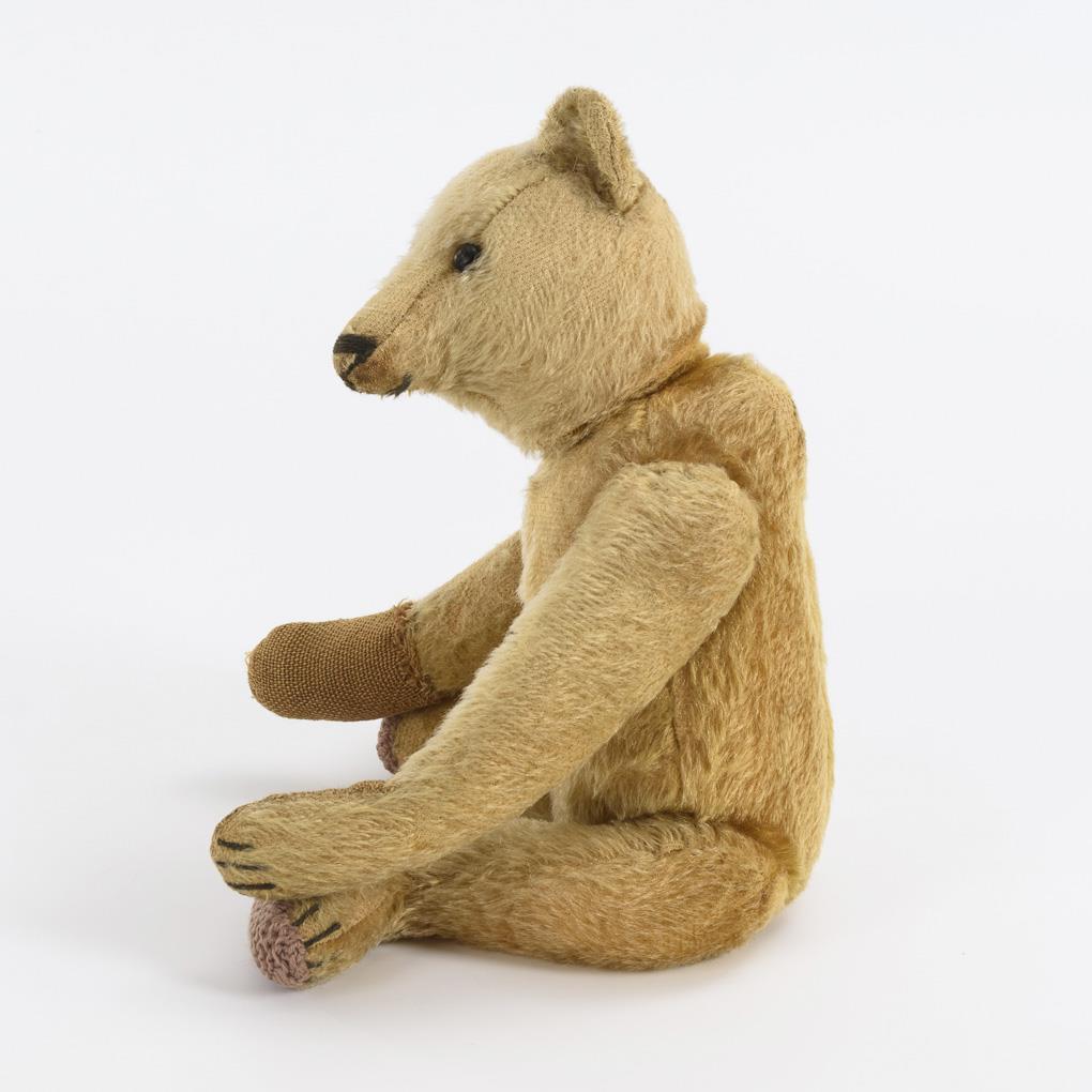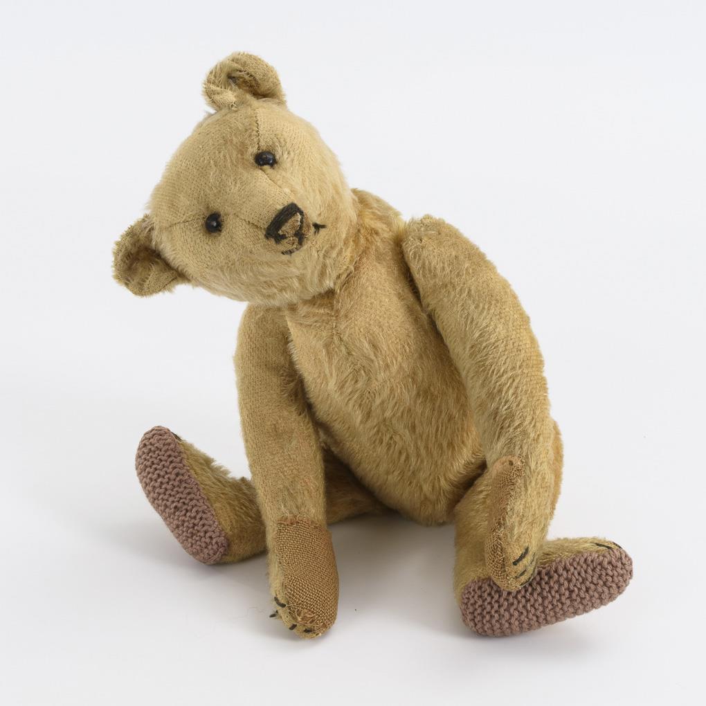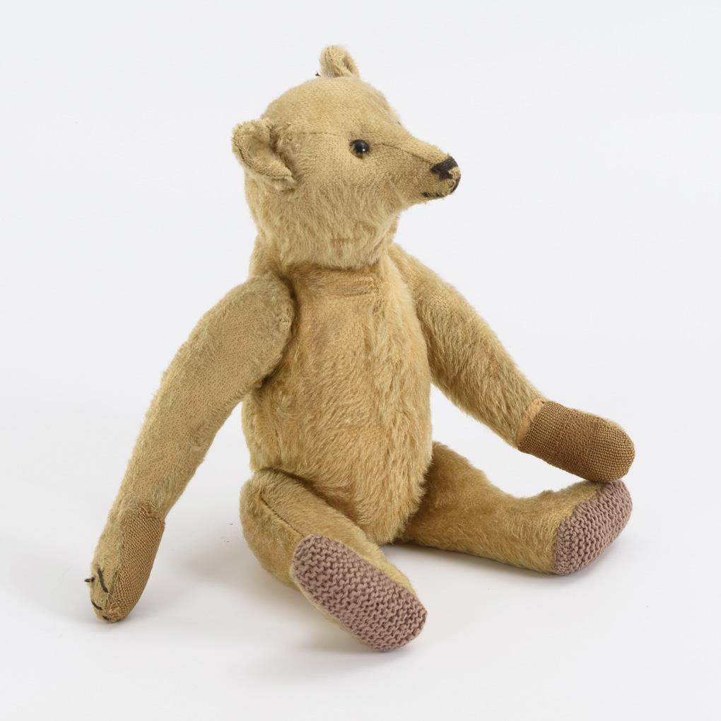 Teddy with turning head and black shoebutton eyes. Paws overstitched, voice muted.