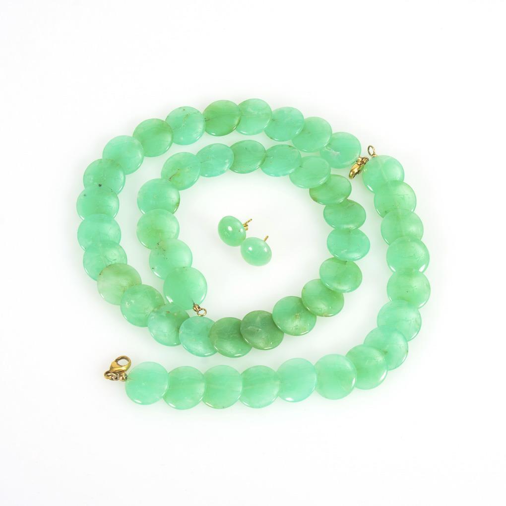 Lacing chains with chyrospas discs, on lobster clasp. Stud earrings with cabochon, on pin mechanism.