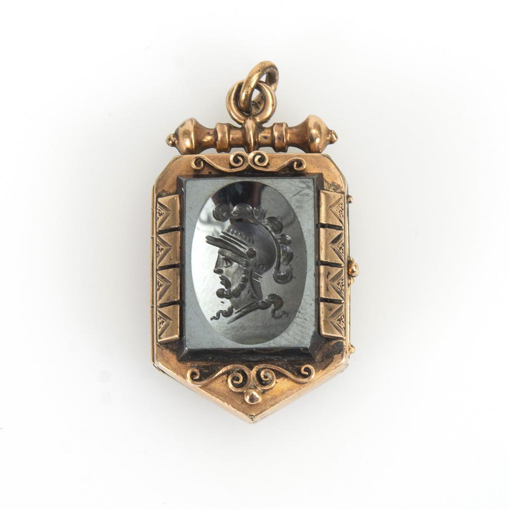 Hematite plaque with antique cut soldier's profile head. 2 framed glazed inner compartments. 1 glazing missing.