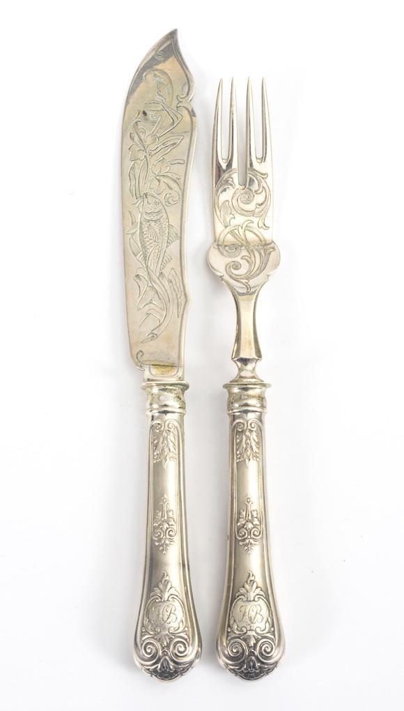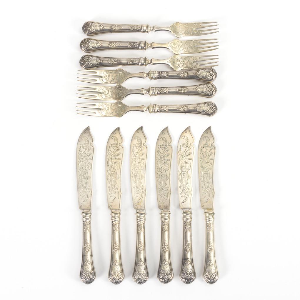 6 knives and 6 forks with filled handles, both sides in relief with baroque ornament, each engraved with monogram "HB". Blades engraved on both sides with fish, tines engraved on one side with vines. A few traces of use on the case.