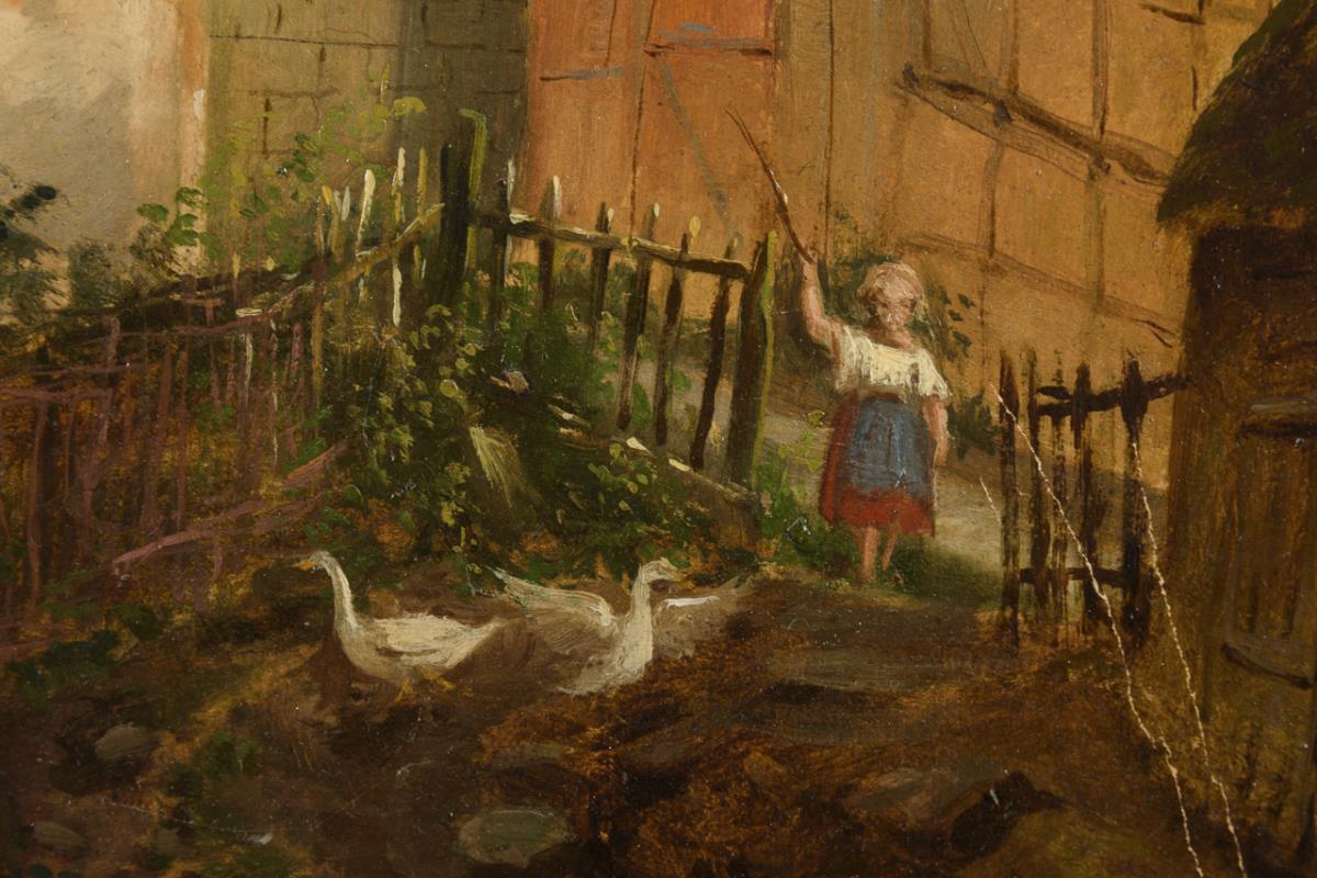 The Girl with the Ducks at the Garden Gate in the Sunshine. Traces of age.