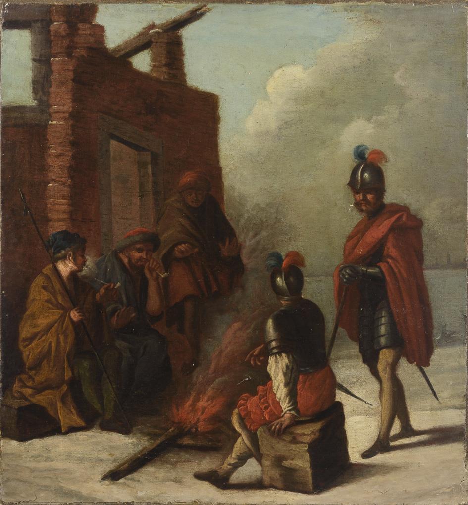 Soldiers and Piper Smokers at the Campfire at a Ruin on a Winter Day. Canvas doubled.