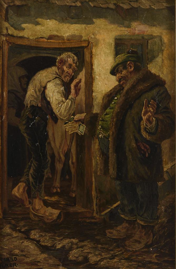 Wealthy merchant with banknotes talking with a poor peasant at the house entrance.