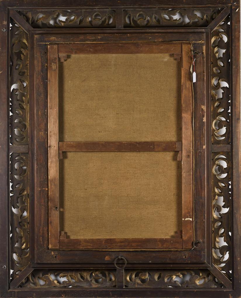 70 x 100 cm. Framed : 118 x 146 cm (heavy ajour carved gold stucco frame).