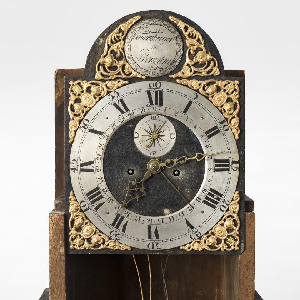 brass wheel movement with Graham gear and hour strike on bell, running. Dial with bronzed corner appliqués, Roman hours and Arabic minutes, minute circle, small seconds, inner date display, curved brass hands, inscribed "Dannenberger in Prenzlau" in the arc field.
