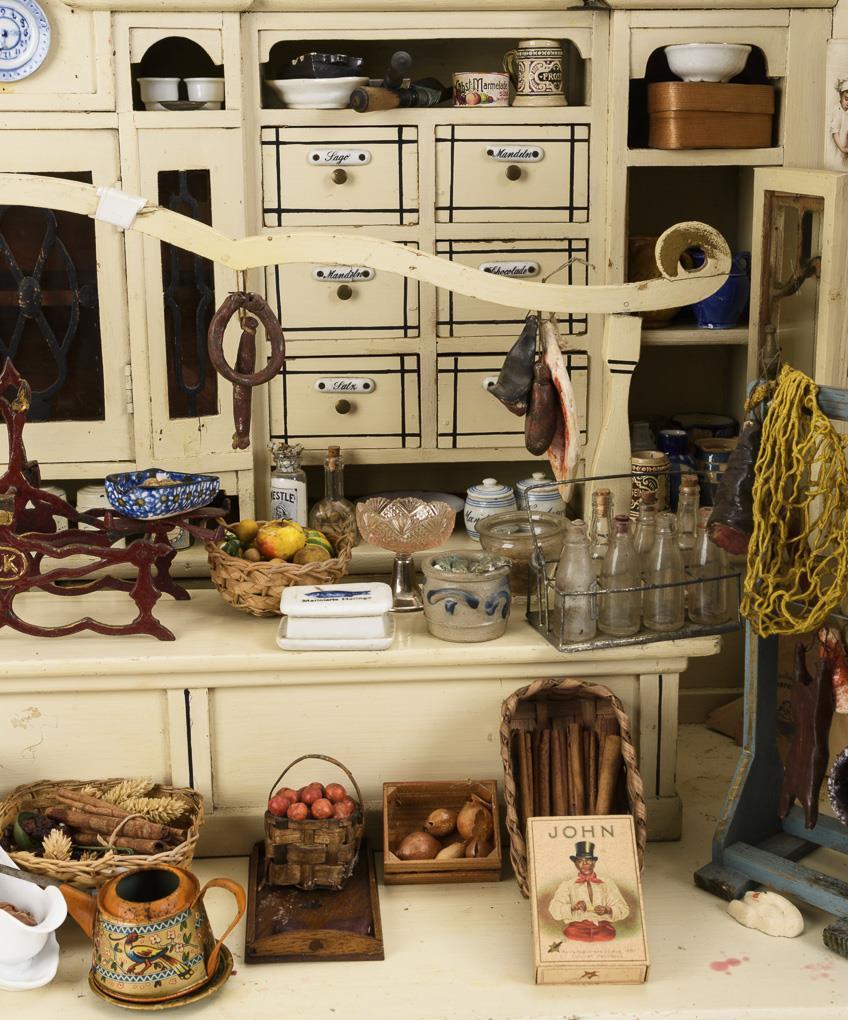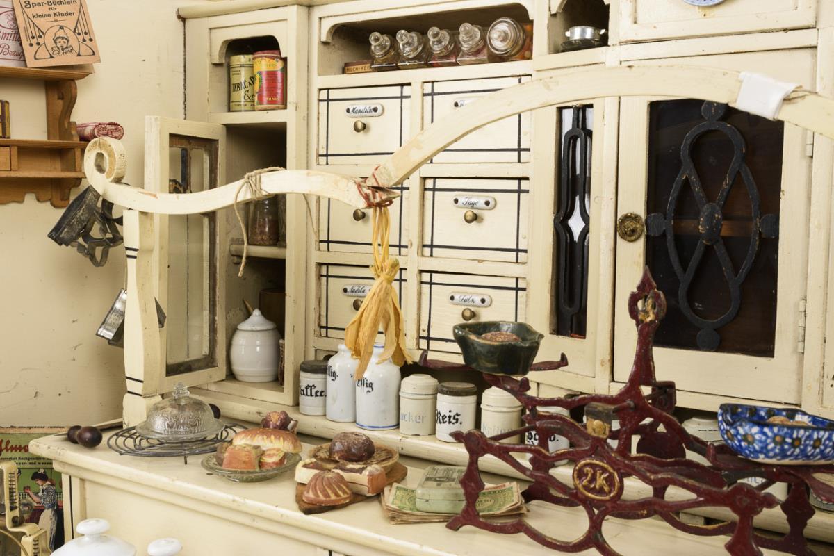 Trapezoidal case with 2 front rails and fixed shop fittings: shelf with 4 glazed doors and 12 labeled drawers, loosely set counter with bekrönung. Richly equipped with scales, cash roll, wooden stand, wall shelf and numerous accessories from porcelain and tin. Played, slight signs of age.