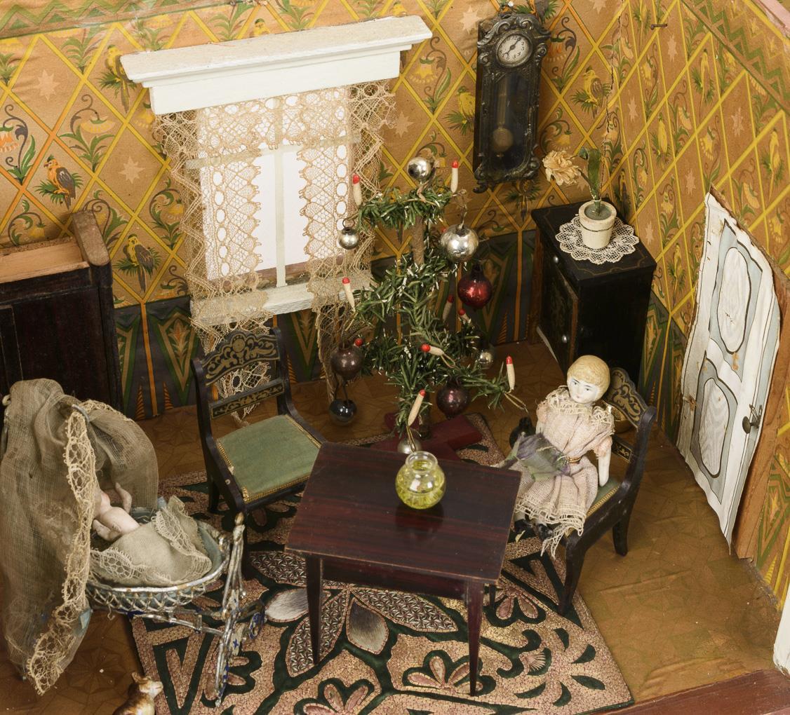 Casing with 2 glazed windows, curtains and younger pasted door. Furnished as a parlor and bedroom, with various small furniture, wall clock, picture frame, Christmas tree and cradle and flower table made of tin. Played with, signs of age and defects.